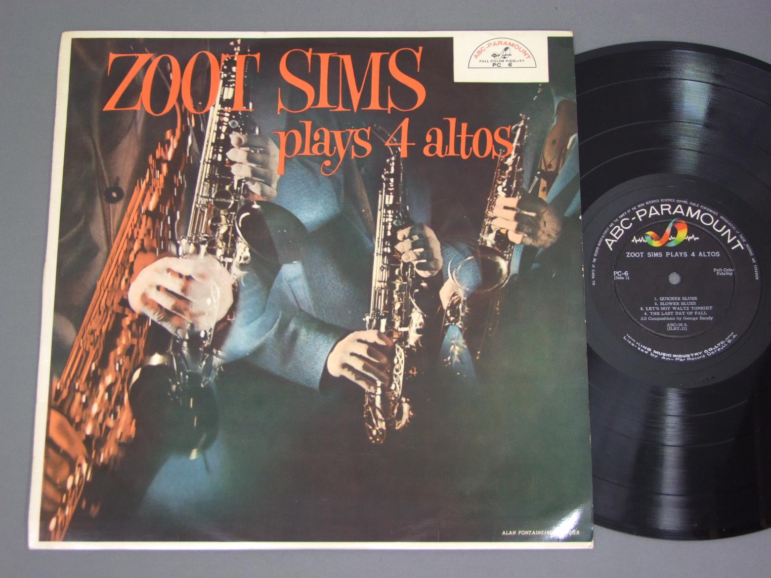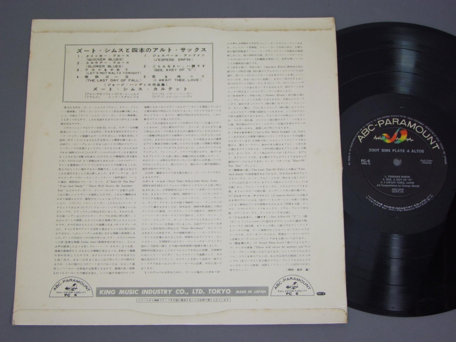 ZOOT SIMS/ZOOT SIMS PLAYS 4 ALTOSぺラジャケ PC6 製造国:日本盤 / Media:LP外観:EX盤の状態:EX 価格(税込):¥2,860(売約済) 送料 7inch:定形外郵便 360円~LP:定形外郵便 660円~送料は、注文の最終画面で確認頂けます。 > > ZOOT SIMS/ZOOT SIMS PLAYS 4 ALTOS 外観 (EX)特記事項:軽いヨレ多少有りますが、全体的にしっかりした印象有り。裏ジャケで日焼けとシミ軽。外観EXの共通説明:ダメージが限定的。中古品としては保存状態がよい方。シミ、ヨゴレ、スレ 少し~軽度。 盤の状態 (EX)特記事項:中身はアメ盤初回です。薄いスリキズが少々程度。きれいな感じの盤面。盤EXの共通説明:盤面のスリキズが薄いものが少し~軽度 音に出そうなものは無いように見える(軽微なソフトティック音は除く)。 Tweet それぞれの画像をクリックすると、大きい写真が見られます こちらの商品もお勧めです 1,980円 EIJI KITAMURA北村英治 / APRIL DATE ( MASTER SOUND PRESSING )エイプリル・デイト (マスターサウンド盤) 1,320円 WILTON FELDERウィルトン・フェルダー / SECRETSシークレッツ 1,210円 TERUMASA HINO日野皓正 / PYRAMIDピラミット 770円 JACQUES LOUSSIER TRIO - ROYAL PHIL. ORCH.ジャック・ルーシェ・トリオ - ロイヤル・フィルハーモニー管弦楽団 / BACH - BRANDENBURG NO5バッハ - ブランデンブルグ協奏曲第5番 440円 SADAO WATANABE渡辺貞夫 / CALIFORNIA SHOWERカリフォルニア・シャワー 1,320円 DON ELLIS ORCHESTRAドン・エリス楽団 / STUDY IN GREAT BIG BAND 20-LIVE AT MONTEREY !ライヴ・アット・モンタレー 1,210円 ERIC DOLPHYエリック・ドルフィー / AT THE FIVE SPOTアット・ザ・5・スポットVOL2 1,320円 TERUMASA HINO SEXTET日野皓正セクステット / FUJI藤