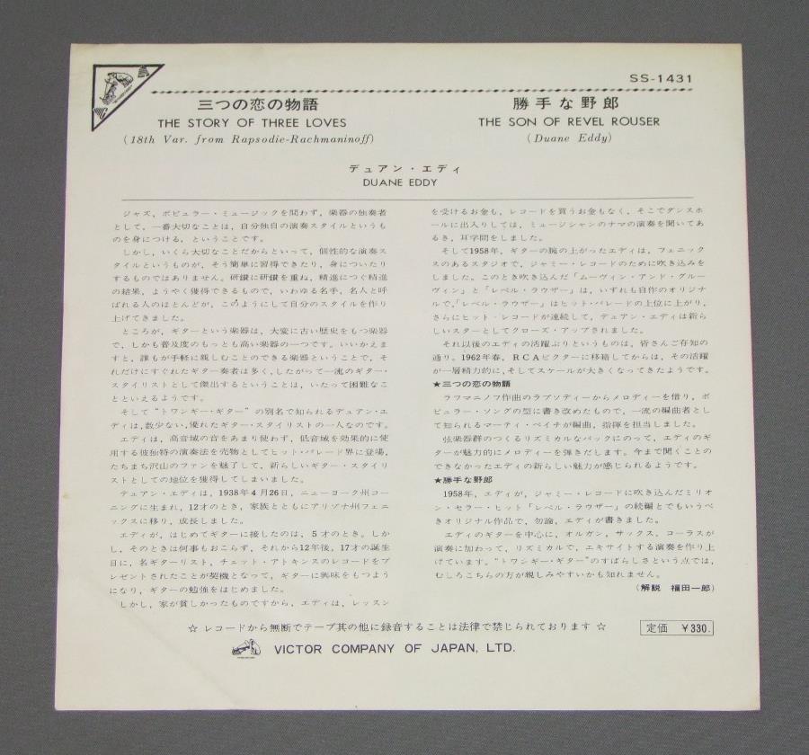 ジャケのみ デュアン・エディー/ 三つの恋の物語 SS1431 製造国:日本盤 / Media:7inch外観:EX 価格(税込):¥1,650(売約済) 送料 7inch:定形外郵便 360円~LP:定形外郵便 660円~送料は、注文の最終画面で確認頂けます。 > > / 外観 (EX)特記事項:下のほうでヨレ少々有り。外観EXの共通説明:ダメージが限定的。中古品としては保存状態がよい方。シミ、ヨゴレ、スレ 少し~軽度。 盤の状態 ()特記事項:盤の付属はありません。盤の共通説明: その他:ジャケのみです。盤は探してください。 Tweet それぞれの画像をクリックすると、大きい写真が見られます こちらの商品もお勧めです 440円 VENTURESベンチャーズ / POPS IN JAPANポップス・イン・ジャパン 1,210円 ELVIS PRESLEY / ELVIS IN PERSONプレスリー・イン・パーソン 1,320円 ELVIS PRESLEY / THAT`S THE WAY IT ISこの胸のときめきを 990円 RICK NELSONリック・ネルソン / ALBUM SEVEN BY RICKアルバム・セブン・バイ・リック 1,210円 ELVIS PRESLEYエルヴィス・プレスリー / THAT`S THE WAY IT ISこの胸のときめきを 770円 WANDA JACKSONワンダ・ジャクスン / WANDA JACKSON COUNTRY !ワンダ・ジャクスン・カントリー 1,210円 VENTURES / BEST OF THE VENTURES vol.2 RED VINYL赤盤 880円 VENTURESベンチャーズ / JOYジョイ -ディスカバー・クラシック-