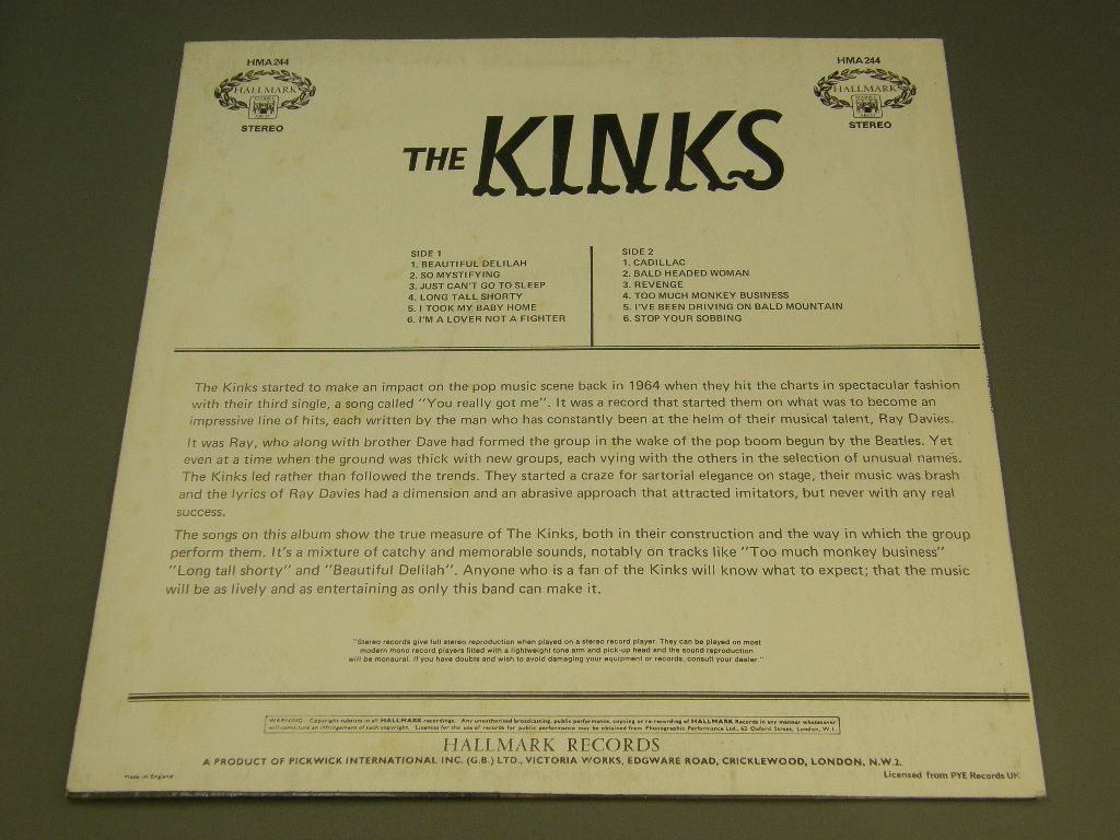 KINKS/KINKS /HALLMARK LBL HMA244 製造国:英国盤 / Media:LPMatrix:両面とも1外観:EX-盤の状態:EX 価格(税込):¥1,540(売約済) 送料 7inch:定形外郵便 360円~LP:定形外郵便 660円~送料は、注文の最終画面で確認頂けます。 レコード検索 > 全てのジャンル > KINKS/KINKS /HALLMARK LBL 外観 (EX-)特記事項:表ジャケはヘリに薄いシワ程度。きれいな色合いです。裏ジャケは全体に薄っすらのスレと、シミが有ります。角スレも少ししかなくきれいな状態。外観EX-の共通説明:ダメージ軽度~多少。 中古品としては普通の状態。シミ、ヨゴレ、スレなど軽く~多少。 盤の状態 (EX)特記事項:両面とも盤が薄っすらとすれているぐらい。冒頭や、曲間でもチリプチは少しだけ。音もしっかりなっており、美品の状態と思います。盤EXの共通説明:盤面のスリキズが薄いものが少し~軽度 音に出そうなものは無いように見える(軽微なソフトティック音は除く)。 その他:HALLMARK LBLからの編集盤。 Tweet それぞれの画像をクリックすると、大きい写真が見られます こちらの商品もお勧めです 3,850円 RAY DAVIES / AMERICANA