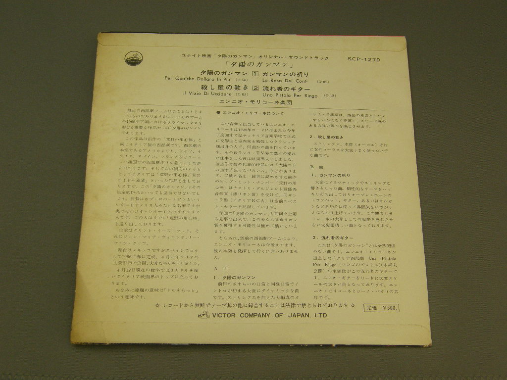 ENNIO MORRICONE エンリオ・モリコーネ楽団/ 夕陽のガンマン4曲入EP SCP1279 製造国:日本盤 / Media:7inch外観:VG+盤の状態:EX- 価格(税込):¥1,100(売約済) 送料 7inch:定形外郵便 360円~LP:定形外郵便 660円~送料は、注文の最終画面で確認頂けます。 > > ENNIO MORRICONE / 外観 (VG+)特記事項:角スレやヘリスレ多少有り。レコード取り出し口下で折れ有り。裏ジャケは日焼けやよごれ軽。外観VG+の共通説明:ダメージやや有り。シミ、ヨゴレ、スレなど多少~やや多め。 盤の状態 (EX-)特記事項:ヘアライン風や紙スレ風スリキズ多少有り。盤EX-の共通説明:盤面のスリキズが多少有り。音に出そうなものは殆ど無いように見える~さほど気にならないぐらいの軽いプチ数カ所程度。 Tweet それぞれの画像をクリックすると、大きい写真が見られます こちらの商品もお勧めです 770円 JOHN ADDISONジョン・アディスン監督 / SOUNDTRACK BRIDGE TOO FAR映画 遠すぎた橋 660円 RALPH BURNSラルフ・バーンズ / SOUND TRACK ALL THAT JAZZ映画オール・ザット・ジャズ 1,320円 KIYOSHI ATSUMI渥美清 倍賞千恵子 他 / OTOKO HA TURAIYO SOUND TRACK映画男はつらいよ御存知名場面集 1,650円 MOMOE YAMAGUCHI & TOMOKAZU MIURA山口百恵と三浦友和 / WHITE LOVEホワイト・ラブ 770円 VANGELISヴァンゲリス / CHARIOTS OF FIREチャリオッツ・オブ・ファイアー 1,320円 JERRY GOLDSMITHジェリー・ゴールドスミス / STAR TREK THE MOTION PICTUREスター・トレック 770円 ORIGINAL SOUND TRACKオリジナル・サウンドトラック / SUPERMAN 2映画 スーパーマン2 冒険編 1,210円 JOHN BARRYジョン・バリー / 10th ANNIVERSARY JAMES BOND ALBUM映画007 スーパー・パック