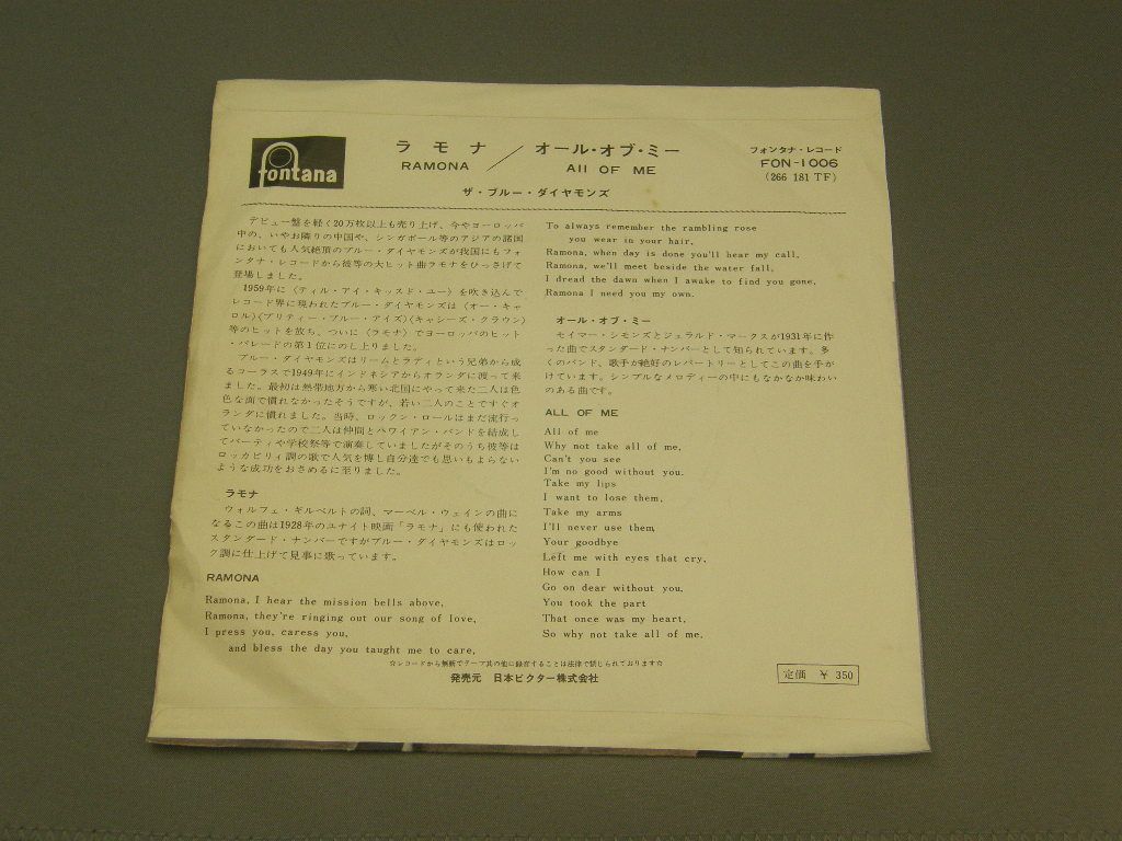 BULE DIAMONDSブルー・ダイアモンズ/RAMONAラモナ FON1006 製造国:日本盤 / Media:7inch外観:EX-盤の状態:EX 価格(税込):¥770 送料 7inch:定形外郵便 360円~LP:定形外郵便 660円~送料は、注文の最終画面で確認頂けます。 > > BULE DIAMONDS/RAMONA 外観 (EX-)特記事項:軽いヨレ多少有り。外観EX-の共通説明:ダメージ軽度~多少。 中古品としては普通の状態。シミ、ヨゴレ、スレなど軽く~多少。 盤の状態 (EX)特記事項:薄いスリキズが少々。盤EXの共通説明:盤面のスリキズが薄いものが少し~軽度 音に出そうなものは無いように見える(軽微なソフトティック音は除く)。 その他:350円定価。インドネシア出身、移住先のオランダで爆発的ヒット。ヨーロッパのチャートでナンバーワンヒット。 Tweet それぞれの画像をクリックすると、大きい写真が見られます こちらの商品もお勧めです 2,420円 CLIFF RICHARDクリフ・リチャード / CLIFF IN JAPAN 880円 LETTERMENレターメン / LOVE BOOK愛の世界 1,650円 ELVIS PLESLEYエルヴィス.プレスリー / ELVIS-THAT`S THE WAY IT ISエルヴィス.オン・ステージVOL.1 770円 WANDA JACKSONワンダ・ジャクスン / WANDA JACKSON COUNTRY !ワンダ・ジャクスン・カントリー 1,210円 ELVIS PRESLEYエルヴィス・プレスリー / THAT`S THE WAY IT ISこの胸のときめきを 1,210円 ELVIS PRESLEY / ELVIS IN PERSONプレスリー・イン・パーソン 770円 RICK NELSONリック・ネルソン / ALBUM SEVEN BY RICKアルバム・セブン・リック 880円 VENTURESベンチャーズ / JOYジョイ -ディスカバー・クラシック-