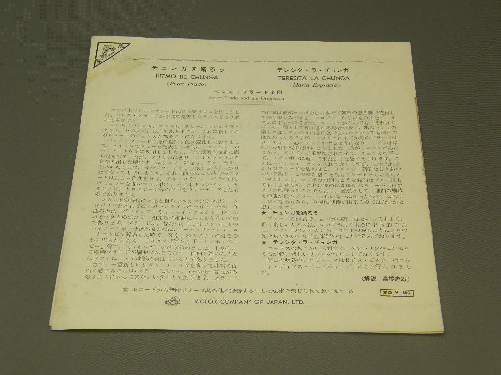 PEREZ PRADOペレス・プラード楽団/RITMO DE CHENGAチュンガを踊ろう SS1269 製造国:日本盤 / Media:7inch外観:EX-盤の状態:EX- 価格(税込):¥330(売約済) 送料 7inch:定形外郵便 360円~LP:定形外郵便 660円~送料は、注文の最終画面で確認頂けます。 > > PEREZ PRADO/RITMO DE CHENGA 外観 (EX-)特記事項:軽いヨレ多少有り。見開きや裏ジャケに薄いよごれ。見開きステップの箇所に書き込み。外観EX-の共通説明:ダメージ軽度~多少。 中古品としては普通の状態。シミ、ヨゴレ、スレなど軽く~多少。 盤の状態 (EX-)特記事項:紙スレ風や薄い軽微な感じの細いスリキズ多少有り。盤EX-の共通説明:盤面のスリキズが多少有り。音に出そうなものは殆ど無いように見える~さほど気にならないぐらいの軽いプチ数カ所程度。 Tweet それぞれの画像をクリックすると、大きい写真が見られます こちらの商品もお勧めです 1,320円 TOKYO CUBAN BOYS東京キューバン・ボーイズ / OPERATION XAVIER CUGARTザビア・クガー作戦 770円 RECORDED IN YUGOSLAVIA現地録音 / YUGOSLAVIAユーゴスラヴィア - バルカンに響くコロの踊り(フィリップス民俗音楽世界地図5) 770円 KARPATY MIHALY & HIS ORCH.カールパーティ・ミハーイ楽団 / HUNGARYハンガリー - ジプシー・ヴァイオリンとチャールダーシュ(フィリップス民俗音楽世界地図3) 880円 UNA RAMOSウニャ・ラモス / UNA RAMOS TWIN DELUXE豪華盤ウニャ・ラモス大全集 1,210円 BOLIVIA & PERU TRADITIONAL MUSIC民族音楽シリーズ ボリビアとペルーの伝統音楽 / FESTIVAL & DANCING OF ANDESアンデスの祭りと踊り 1,210円 EAST EUROPE GYPSY MUSIC民族音楽シリーズ 東欧のジプシー音楽 / JANOS RACZ - RUSSES ET HONGROISESヤーノシュ・ラーツのジプシー・ヴァイオリン 990円 RUSS CASE AND HIS SYMPHONIC GYPSIESラス・ケースとシンフォニック・ジプシー楽団 / ONENIGHT IN HUNGARYハンガリーの夜 1,320円 BUDAPEST STRING QUARTETブダペスト弦楽四重奏団 / MOZARTO - STRING QUARTETモーツァルト - 弦楽五重奏曲