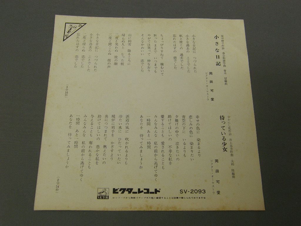 岡田可愛/ 小さな日記 SV2093 製造国:日本盤 / Media:7inch外観:EX-盤の状態:EX 価格(税込):¥1,047(売約済) 送料 7inch:定形外郵便 360円~LP:定形外郵便 660円~送料は、注文の最終画面で確認頂けます。 > > / 外観 (EX-)特記事項:ヨレは少な目ですが、裏ジャケ側にシミやや有り。表側も僅かによごれ軽少々。外観EX-の共通説明:ダメージ軽度~多少。 中古品としては普通の状態。シミ、ヨゴレ、スレなど軽く~多少。 盤の状態 (EX)特記事項:薄いスリキズ少々。盤EXの共通説明:盤面のスリキズが薄いものが少し~軽度 音に出そうなものは無いように見える(軽微なソフトティック音は除く)。 Tweet それぞれの画像をクリックすると、大きい写真が見られます こちらの商品もお勧めです 550円 SONOKO KAWAI河合その子 / SONOKOその子 770円 ERI NITTA新田恵利 / ERI 1,210円 SAYURI KOKUSHO国生さゆり / TRANSIT 990円 YOSHIMI IWASAKI岩崎良美 / SAISONS (2nd ALBUM)セゾン(2nd ALBUM) 1,210円 PINK LADYピンク・レディー / `78 JUMPING SUMMER CARNIVAL`78 ジャンピング・サマー・カーニバル 770円 NAOKO KAWAI河合奈保子 / NAOKO IN CONCERT河合奈保子 カナリー・コンサート PART 2 660円 HIROKO TANIYAMA谷山浩子 / MOUHITORI NO ALICEもうひとりのアリス 770円 TOMOYO HARADA原田知世 / NADESHIKO JUNJO撫子純情(なでしこじゅんじょう)-拾七歳バースデイ・アルバム