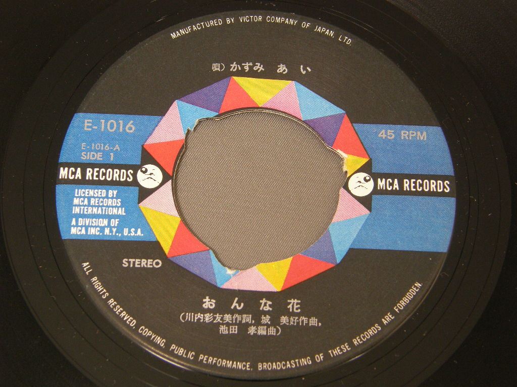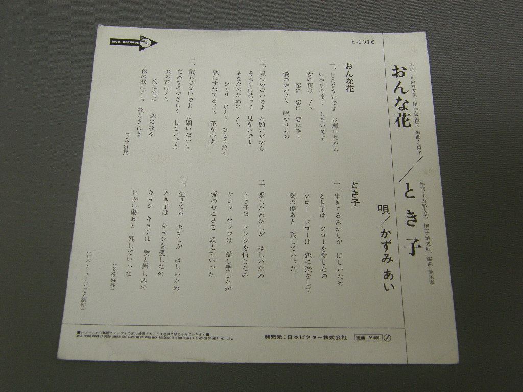 KAZUMI AIかずみあい/ ONNA HANAおんな花 E1016 製造国:日本盤 / Media:7inch外観:EX-盤の状態:EX- 価格(税込):¥440 送料 7inch:定形外郵便 360円~LP:定形外郵便 660円~送料は、注文の最終画面で確認頂けます。 > > KAZUMI AI/ ONNA HANA 外観 (EX-)特記事項:ヨレは少なめですが、シミ軽多少有り。外観EX-の共通説明:ダメージ軽度~多少。 中古品としては普通の状態。シミ、ヨゴレ、スレなど軽く~多少。 盤の状態 (EX-)特記事項:薄いスリキズ少々。センター穴脱落。盤EX-の共通説明:盤面のスリキズが多少有り。音に出そうなものは殆ど無いように見える~さほど気にならないぐらいの軽いプチ数カ所程度。 Tweet それぞれの画像をクリックすると、大きい写真が見られます こちらの商品もお勧めです 1,320円 YUMI ARAI荒井由実 / YUMING BRAND PART3ユーミン・ブラインド・パート3 770円 RYOKO MORIYAMA森山良子 / RYOKO MORIYAMA COLLEGE FOLK ALBUM森山良子カレッジ・フォーク・アルバム 2,200円 ALFEEアルフィー / MASTAER SOUND PRESSINGザ・ルネッサンス MASTER SOUND盤 1,210円 HIROKUNI KOREKATA是方博邦 / MELODY CITYメロディ・シティ 990円 YUKO TOMITAとみたゆう子 / DEUXDEUX (2nd ALBUM) 1,210円 TAKURO YOSHIDAよしだたくろう / ON STAGEオン・ステージ - ともだち 770円 MOTOHARU SANO佐野元春 / VISITORS 770円 KENJI SAWADA沢田研二 / OMOIKKIRI KIZANA JINSEI思いきり気障な人生