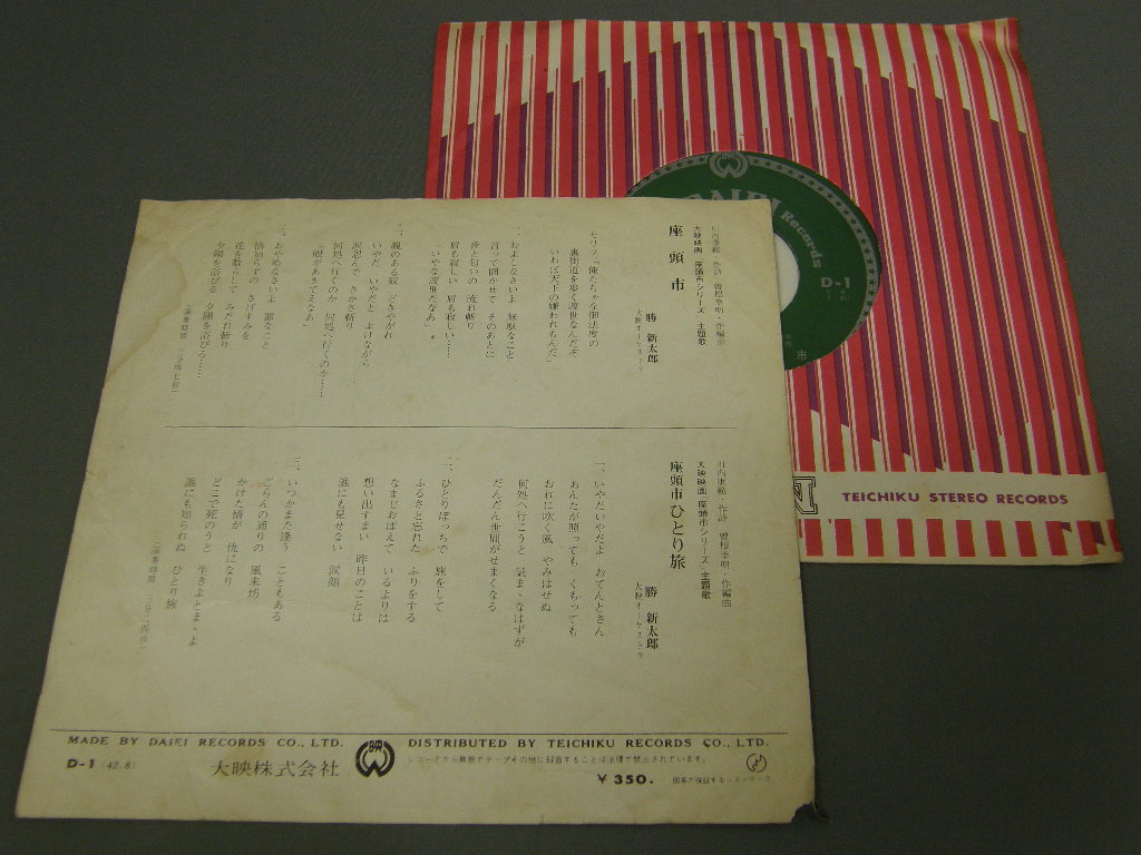 SOUND TRACK ZATOICHIサントラ 座頭市/SHINTARO KATU勝新太郎 D1 製造国:日本盤 / Media:7inch外観:VG盤の状態:VG+ 価格(税込):¥660 送料 7inch:定形外郵便 360円~LP:定形外郵便 660円~送料は、注文の最終画面で確認頂けます。 > > SOUND TRACK ZATOICHI/SHINTARO KATU 外観 (VG)特記事項:ヨレや折れ跡多め。よごれやスレも多少有り。裏側にシミ等よごれ多少有り。外観VGの共通説明:ダメージが見るからに多い。 盤の状態 (VG+)特記事項:薄いスリキズ多少有りますが、あまり触感の無い軽微な感じのものが中心。盤VG+の共通説明:盤面にスリキズが多少~やや有り、音に出そうなものも多少ある。 Tweet それぞれの画像をクリックすると、大きい写真が見られます こちらの商品もお勧めです 1,210円 HACHIRO KASUGA春日八郎 / HACHIRO KASUGA HIT ALBUM春日八郎 -魅力のすべて- 550円 HISAO ITO伊藤久男 / BEST ALBUM懐しの歌声 伊藤久男と共に 880円 村田英雄-青山和子-安達明 他 / コロムビア歌のハイライト (第五集) 660円 AKIRA MATSUDAIRA松平晃 / CIRCUS SONG懐かしの針音 松平晃 サーカスの唄 990円 YOSHIO TABATA田端義夫 / BEST ALBUM歌道ひと筋三十年 田端義夫の傑作全集 心の唄 880円 KEN TSUMURA津村謙 / KAYO ALBUM津村謙歌謡アルバム 1,210円 KEIICHIRO AKAGI赤木圭一郎 / EIEN-NO-TONY永遠のトニー 赤木圭一郎絶唱集 770円 YUJIRO ISHIHARA石原裕次郎 / YUJIRO ISHIHARA ORIGINAL BEST石原裕次郎オリジナルベスト