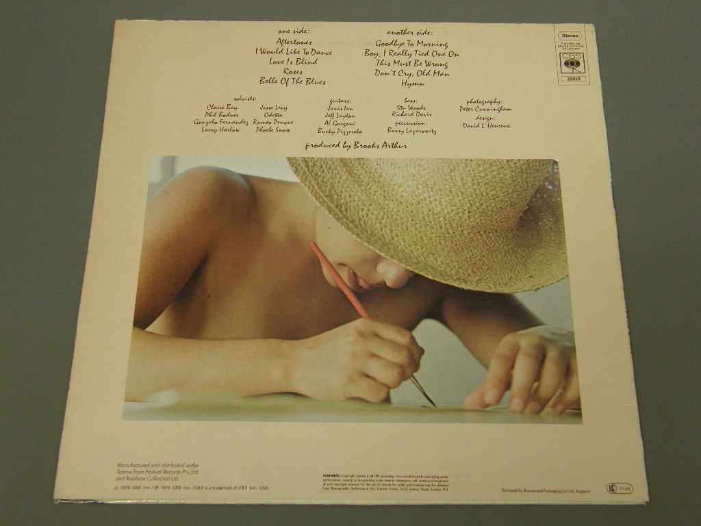 JANIS IAN/AFTERTONES CBS32018 製造国:英国盤 / Media:LPMatrix:A1 / B1外観:EX盤の状態:EX 価格(税込):¥2,200(売約済) 送料 7inch:定形外郵便 360円~LP:定形外郵便 660円~送料は、注文の最終画面で確認頂けます。 > > JANIS IAN/AFTERTONES 外観 (EX)特記事項:表ジャケの上ヘリに近い箇所でスリキズ少々。表ジャケは、背表紙付近に軽いヨレシワが数本。他は全体的にあまりスレやスリキズ無いきれいな感じのジャケ。レコード取り出し口淵でヨレが多少有り。裏ジャケは上ヘリやレコード取り出し口淵でヨレ多少。上の方に軽いスリキズが少し。レコードリングスレ等も薄い感じ。外観EXの共通説明:ダメージが限定的。中古品としては保存状態がよい方。シミ、ヨゴレ、スレ 少し~軽度。 盤の状態 (EX)特記事項:両面薄いスリキズ少し有るのと、B面に極薄いシミのようなプレスミス有り。こちら音には影響ないものです。他も少し聴いてみましたが、チリプチ少し聴こえる程度。音自体も非常に綺麗に鳴っています。盤EXの共通説明:盤面のスリキズが薄いものが少し~軽度 音に出そうなものは無いように見える(軽微なソフトティック音は除く)。 Tweet それぞれの画像をクリックすると、大きい写真が見られます こちらの商品もお勧めです 660円 CLAUDIA DE COLOMBIAクラウディア・デ・コロンビア / YO CREO EN TI君を信じて 〜ジョ・クレオ・エンティ〜 3,520円 CARPENTERS / CARPENTERS 1,650円 REGINE / REGINE 770円 DORIS DAY / GREATEST HITS 770円 BUFFY SAINTE-MARIE / I`M GONNA BE A COUNTRY GIRL AGAIN 770円 DORIS DAY / BEST OF DORIS DAY 1,100円 MIRIAM MAKEBA / FORBIDDEN GAMES 1,210円 LORETTA LYNN / WE`VE COME A LONG WAY BABY