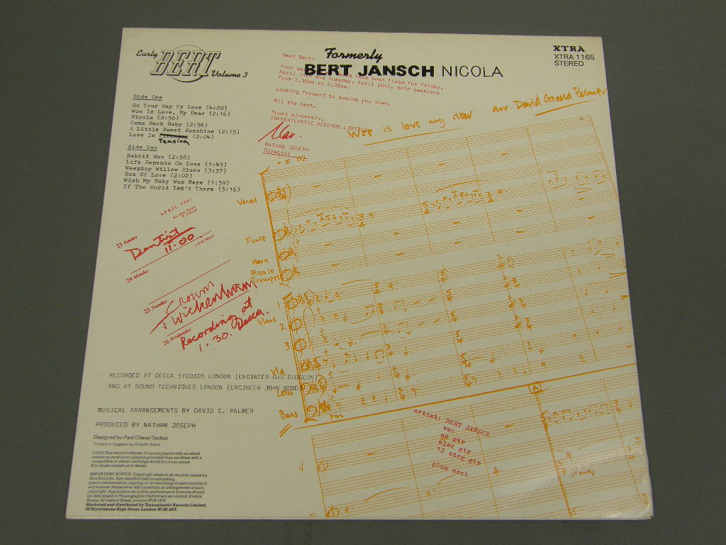 BERT JANSCH/EARLY BERT VOL3 XTRA1165 製造国:英国盤 / Media:LPMatrix:A-1△ / B-1△外観:EX盤の状態:EX 価格(税込):¥1,885(売約済) 送料 7inch:定形外郵便 360円~LP:定形外郵便 660円~送料は、注文の最終画面で確認頂けます。 > > BERT JANSCH/EARLY BERT VOL3 外観 (EX)特記事項:全体的にスレやスリキズあまり無くきれいな感じのジャケ。よごれも少なめです。背表紙下辺りに軽い折れシワ有り。外観EXの共通説明:ダメージが限定的。中古品としては保存状態がよい方。シミ、ヨゴレ、スレ 少し~軽度。 盤の状態 (EX)特記事項:軽微なスリキズ、スレ少しだけです。曲間などを中心に聴いてみましたが、チリプチも少しだけでした。盤EXの共通説明:盤面のスリキズが薄いものが少し~軽度 音に出そうなものは無いように見える(軽微なソフトティック音は除く)。 Tweet それぞれの画像をクリックすると、大きい写真が見られます こちらの商品もお勧めです 770円 GEGEN DEN RHYTHMUS DER ZEIT / FRAUNHOFER SAITENMUSIK 1,100円 CHRISTOF STAHLIN / MAG DENN KEINER DIE BUNDESREPUBLIK? 660円 LESTER FLATT & EARL SCRUGGS / ORIGINAL MERCURY RECORDINGS VOLUME TWO 770円 CURT MALM / PROST LIEBE SEELE ! 990円 JIM MacLEOD AND HIS BAND / SOUND OF SCOTLAND 990円 CHARLIE RICH / FULLY REALIZED 770円 WERNER LAMMERHIRT / DIE DRITTE 770円 CHRISTOF STAHLIN / EIN BEITRAG ZUR WELT