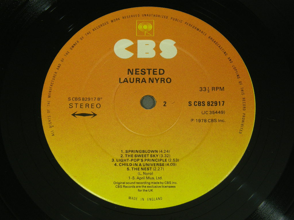 LAURA NYRO/NESTED CBS82917 製造国:英国盤 / Media:LPMatrix:A-2 / B-2外観:EX盤の状態:EX 価格(税込):¥2,420(売約済) 送料 7inch:定形外郵便 360円~LP:定形外郵便 660円~送料は、注文の最終画面で確認頂けます。 > > LAURA NYRO/NESTED 外観 (EX)特記事項:上ヘリでスレ少々、底角でスレ多少。表ジャケは背のヘリでスレちょっと有り、また、上下にレコードリングスレのよごれが少し。レコード取り出し口上付近にSAMPLE盤スタンプ軽と角で小さなぶつかり跡。 裏ジャケはやはり薄めのレコードリングスレと左上隅にサンプルのスタンプ。 オリジナルインナーは軽いスレが少し。抜けやヨレは無いです。外観EXの共通説明:ダメージが限定的。中古品としては保存状態がよい方。シミ、ヨゴレ、スレ 少し~軽度。 盤の状態 (EX)特記事項:軽微なスリキズ両面少しだけ。一見して美盤です。B2の最後フェイドアウトする所で、4回ぐらい少しチッとなるスリキズの集まりが有りますが、他は音に出そうなものも無く、見た目に綺麗です。静かな所を中心に聴いてみましたが、チリプチも僅かな様子。美品クラスの綺麗さです。盤EXの共通説明:盤面のスリキズが薄いものが少し~軽度 音に出そうなものは無いように見える(軽微なソフトティック音は除く)。 Tweet それぞれの画像をクリックすると、大きい写真が見られます こちらの商品もお勧めです 924円 OLIVEA NEWTON-JOHN / MAKING A GOOD THING BETTER 770円 BUFFY SAINTE-MARIE / I`M GONNA BE A COUNTRY GIRL AGAIN 1,650円 REGINE / REGINE 660円 PETULA CLARK / JUST PETULA 1,320円 EYDIE GORME / HERE`S EYDIE GORME 880円 LIBBY HOLMAN / SOMETHING TO REMEMBER HER BY 1,100円 NYDIA CARO / NYDIA CARO 770円 RITA COOLIDGE / HEARTBREAK RADIO