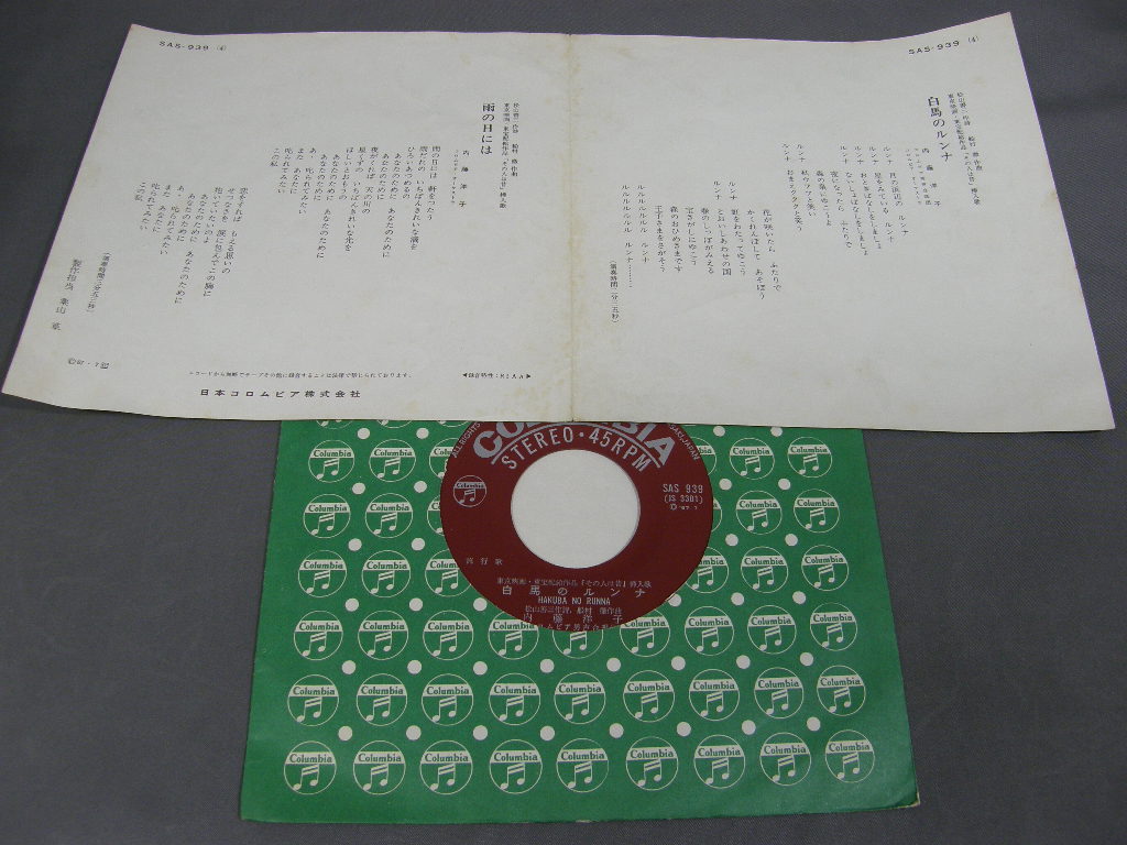 内藤洋子/ 白馬のルンナ SAS-939 製造国:日本盤 / Media:7inch外観:EX-盤の状態:EX 価格(税込):¥4,400(売約済) 送料 7inch:定形外郵便 360円~LP:定形外郵便 660円~送料は、注文の最終画面で確認頂けます。 > > / 外観 (EX-)特記事項:ヨレシワは少し程度。シミっぽさが表裏、見開き杜も多少有りますが、色合いも未だしっかりしています。外観EX-の共通説明:ダメージ軽度~多少。 中古品としては普通の状態。シミ、ヨゴレ、スレなど軽く~多少。 盤の状態 (EX)特記事項:紙スレ風の軽微なスリキズ軽く有るぐらい。きれいな感じです。盤EXの共通説明:盤面のスリキズが薄いものが少し~軽度 音に出そうなものは無いように見える(軽微なソフトティック音は除く)。 Tweet それぞれの画像をクリックすると、大きい写真が見られます こちらの商品もお勧めです 1,320円 藤山一郎 - 美空ひばり - 高峰三枝子 - 織井茂子 他 / ベスト20 特選-映画主題歌集 (2) 660円 MISAO MATSUBARA松原操 / COLLECTION VOL2第ニ集-浮草の唄 880円 上原敏 / 憶い出の任侠・時代歌謡-ポリドール SP原盤 シリーズ 880円 上原敏 / ポリドール(SP原盤)シリーズ -第6集- 哀愁の抒情・マドロス歌謡 770円 YUJIRO ISHIHARA石原裕次郎 / YUJIRO ISHIHARA ORIGINAL BEST石原裕次郎オリジナルベスト 880円 TOSHIRO OKAMOTO岡本敦朗 / SHIROI HANA NO SAKUKORO白い花の咲く頃 990円 YOSHIO TABATA田端義夫 / BEST ALBUM歌道ひと筋三十年 田端義夫の傑作全集 心の唄 1,210円 HACHIRO KASUGA春日八郎 / HACHIRO KASUGA HIT ALBUM春日八郎 -魅力のすべて-