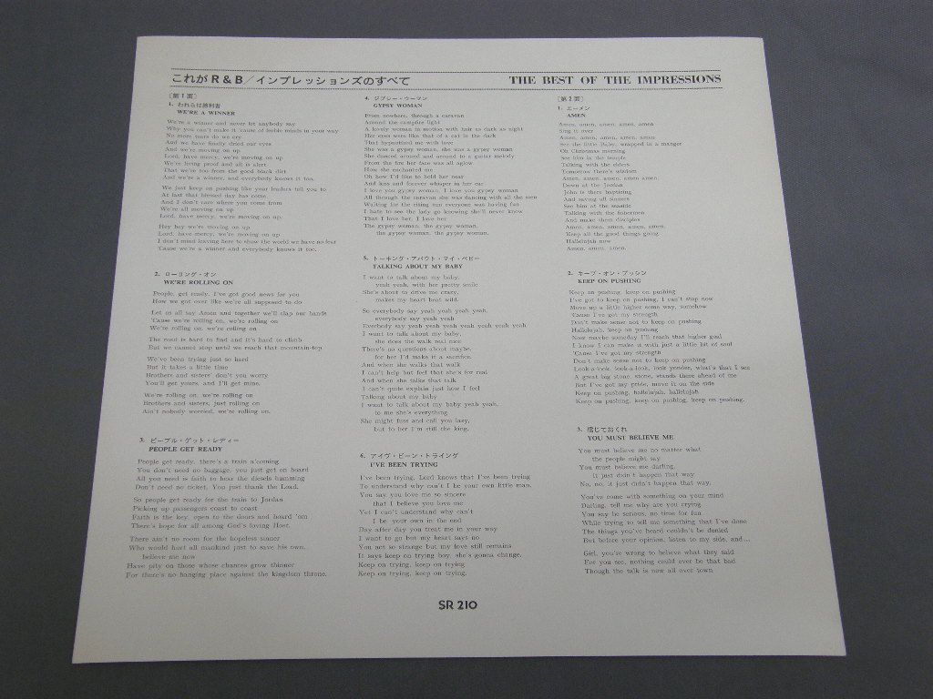 IMPRESSIONS/BEST OF THE IMPRESSIONSペラジャケ SR210 製造国:日本盤 / Media:LP外観:EX+盤の状態:EX+ 価格(税込):¥2,860(売約済) 送料 7inch:定形外郵便 360円~LP:定形外郵便 660円~送料は、注文の最終画面で確認頂けます。 > > IMPRESSIONS/BEST OF THE IMPRESSIONS 外観 (EX+)特記事項:全体的にあまりスレやスリキズ無くきれいな状態。歌詞カード付。外観EX+の共通説明:中古としては美品、一見してきれいでダメージが軽微。シミ、ヨゴレ、スレ有っても僅か~少し。 盤の状態 (EX+)特記事項:極薄のスリキズ数本程度。一見して素晴らしい状態です。盤EX+の共通説明:盤面の極薄いスリキズ、スレ少し程度 音に出そうなものは無いように見える(極軽微なソフトティック音は除く)。 その他:白見本盤 Tweet それぞれの画像をクリックすると、大きい写真が見られます こちらの商品もお勧めです 1,320円 SMOKEY ROBINSONスモーキー・ロビンソン / BEING WITH YOUビーイング・ウィズ・ユー 1,210円 TAVARESタバレス / NEW DIRECTIONS二人だけのバラード 1,210円 SMOKEY ROBINSONスモーキー・ロビンソン / BLAME IT ON LOVE & ALL THE GREAT HITSブレイム・イット・オン・ラブ 1,210円 EARTH. WIND & FIREアース・ウインド&ファイアー / ELECTRIC UNIVERSEエレクトリック・ユニヴァース 660円 DIANA ROSS / LADY SINGS THE BLUES 770円 PHILIP BAILEYフィリップ・ベイリー / WONDERS OF HIS LOVEワンダーズ・オブ・ヒズ ・ラブ 1,210円 TEMPTATIONSテンプテーションズ / SURFACE THRILLSサーフィス・スリル 1,210円 OTIS REDDINGオーティス・レディング / RECORDED LIVEビッグ・オー 未発表ライブ
