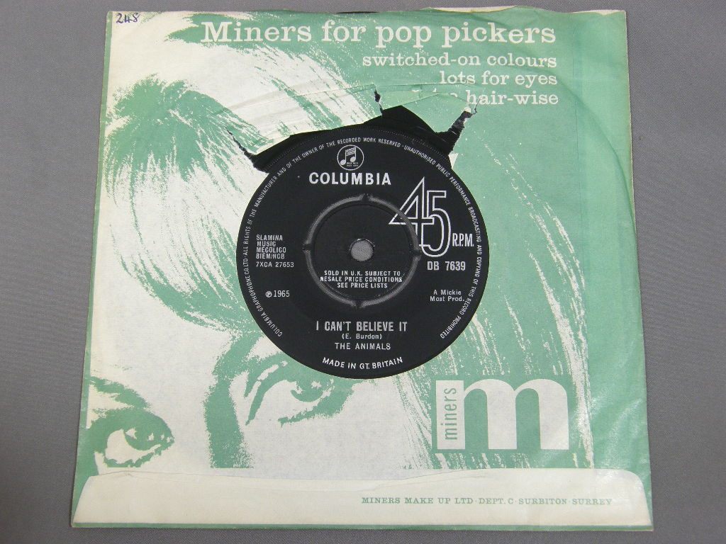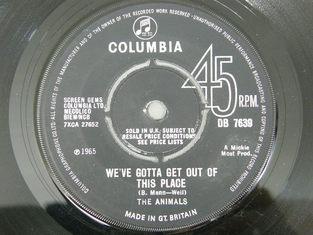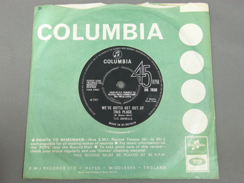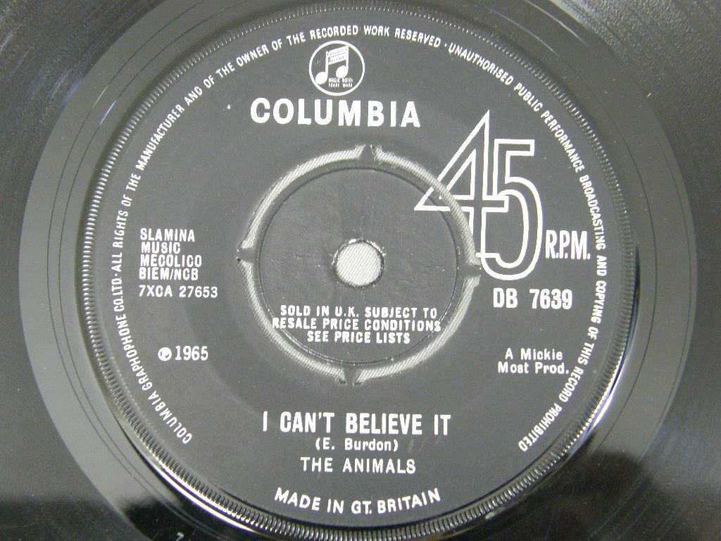ANIMALS/WE`VE GOTTA GET OUT OF THIS PLACE DB7639 製造国:英国盤 / Media:7inchMatrix:-1 / -1外観:EX-盤の状態:EX+ 価格(税込):¥2,200 送料 7inch:定形外郵便 360円~LP:定形外郵便 660円~送料は、注文の最終画面で確認頂けます。 > > ANIMALS/WE`VE GOTTA GET OUT OF THIS PLACE 外観 (EX-)特記事項:COLUMBIA社のカンパニースリーブ付。裏面のセンター穴にヨレや切れありますが、表側はヨレ少なめでしっかりした感じ。抜けは無いです。両面ともレコード取り出し口端に書き込み有り。外観EX-の共通説明:ダメージ軽度~多少。 中古品としては普通の状態。シミ、ヨゴレ、スレなど軽く~多少。 盤の状態 (EX+)特記事項:極薄いスリキズ少しだけ。盤も黒々としており一見して綺麗な状態。モノ針で少し聴いてみましたが、チリノイズ少しだけの素晴らしい再生具合でした。盤EX+の共通説明:盤面の極薄いスリキズ、スレ少し程度 音に出そうなものは無いように見える(極軽微なソフトティック音は除く)。 Tweet それぞれの画像をクリックすると、大きい写真が見られます こちらの商品もお勧めです 4,400円 FREDDIE AND DREAMERS / SING ALONG PARTY 11,000円 CLIFF BENNETT AND HIS BAND / CLIFF BENETT BRANCHES OUT 10,450円 ANIMALS / ANIMAL TRACKS 6,600円 GEORGIE FAME / TWO FACES OF FAME 9,350円 TROGGS / FROM NOWHERE 8,800円 GEORGIE FAME / HALL OF FAME 4,950円 MINDBENDERS / MINDBENDERS 6,600円 SOUNDS INCORPORATED / SOUNDS INCORPORATED MONO