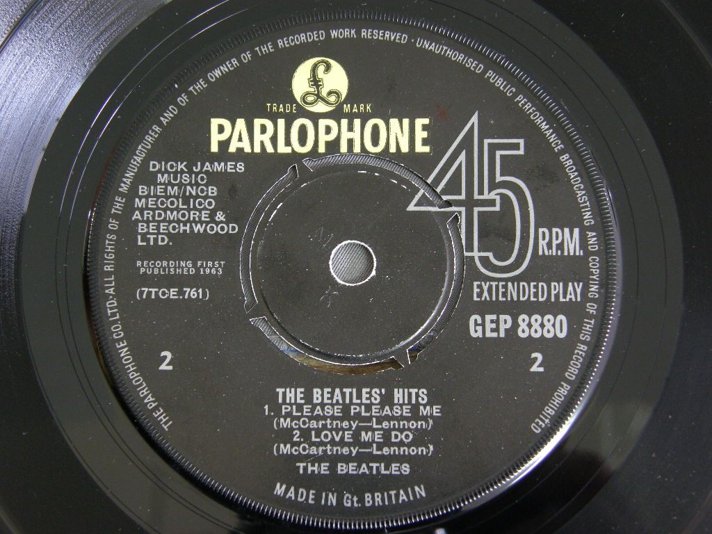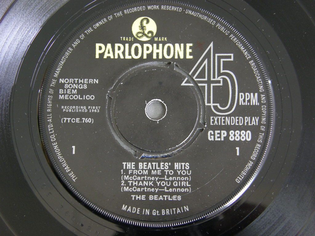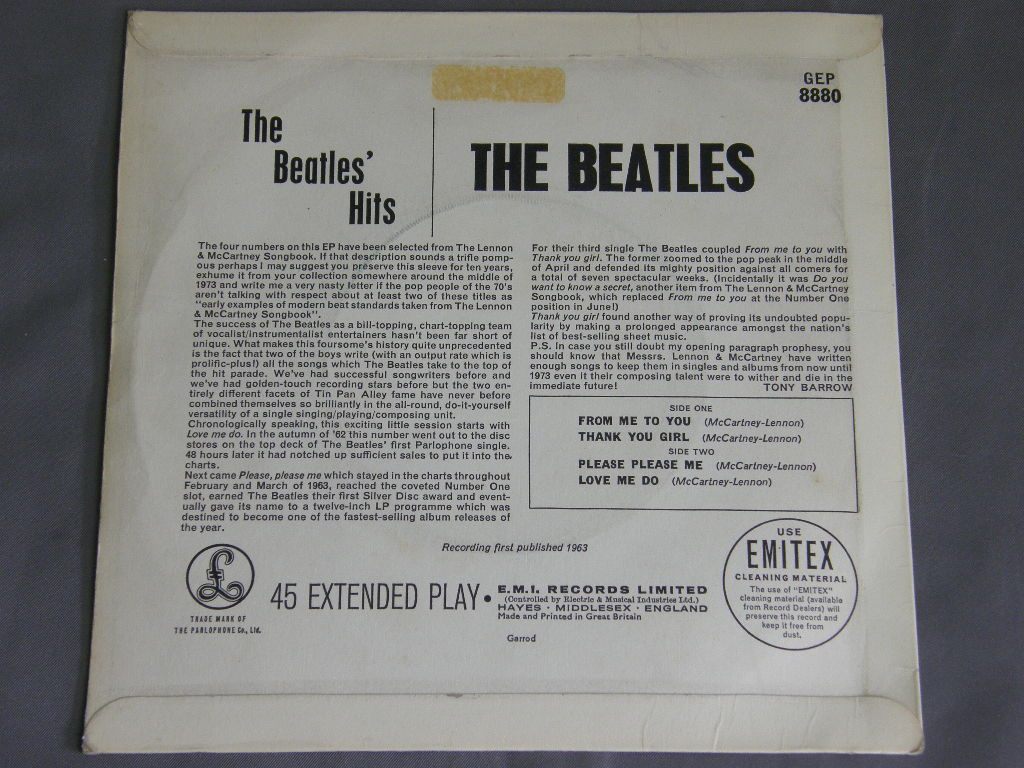 BEATLES/BEATLES` HIT EP GEP8880 製造国:英国盤 / Media:7inchMatrix:2N | 1N外観:EX-盤の状態:EX 価格(税込):¥5,500 送料 7inch:定形外郵便 360円~LP:定形外郵便 660円~送料は、注文の最終画面で確認頂けます。 > > BEATLES/BEATLES` HIT EP 外観 (EX-)特記事項:角スレ多少有り。表ジャケは全体的にスレや擦り傷、コーティングのヨレシワは少ない感じ。周辺部で薄い日焼け感有り。裏ジャケはやはり多少薄い日焼け軽有る簡易。上の方にステッカー跡。外観EX-の共通説明:ダメージ軽度~多少。 中古品としては普通の状態。シミ、ヨゴレ、スレなど軽く~多少。 盤の状態 (EX)特記事項:薄いスリキズ、表面スレ軽く有る感じ。音に出そうなものもなく一見してきれいな状態です。モノ針で少し聴いてみましたがチリノイズ少しだけでした。盤EXの共通説明:盤面のスリキズが薄いものが少し~軽度 音に出そうなものは無いように見える(軽微なソフトティック音は除く)。 その他:レーベルにボールペンでの書き込み。あまり目立たない感じです。 Tweet それぞれの画像をクリックすると、大きい写真が見られます こちらの商品もお勧めです 5,500円 GEORGE HARRISON / LIVING IN THE MATERIAL WORLD 5,500円 JOHN LENNON / SHAVED FISH 5,500円 GEORGE HARRISON / THIRTY THREE & 1/3 4,950円 JOHN & YOKO - PLASTIC ONO BANDF / SOME TIME IN NEW YORK CITY 5,500円 BEATLES / AT THE HOLLYWOOD BOWL