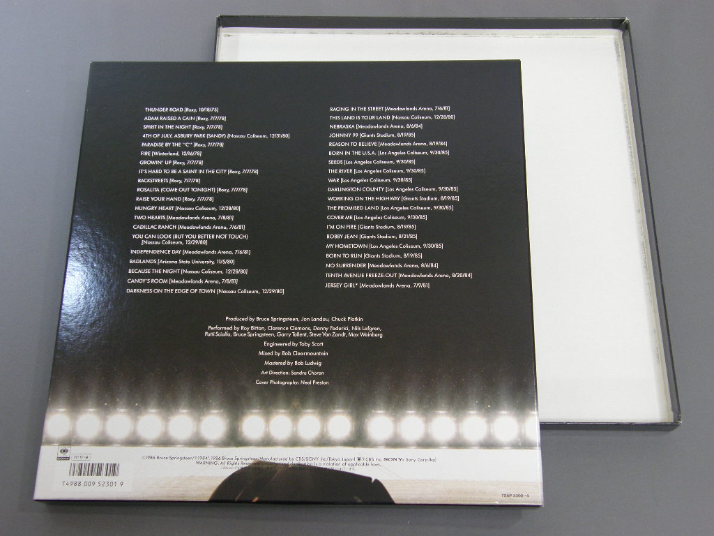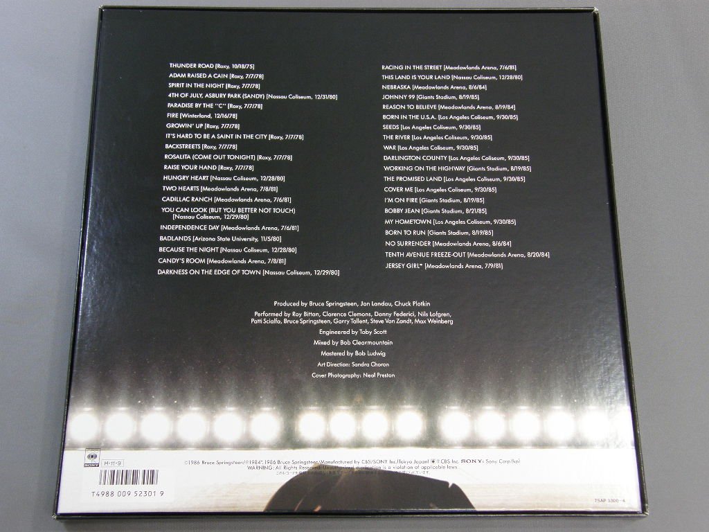 BRUCE SPRINGSTEEN AND THE E STREET BAND/LIVE 1975-85 BOX SET 75AP3300-4 製造国:日本盤 / Media:LP外観:EX+盤の状態:EX+帯:EX 価格(税込):¥2,750(売約済) 送料 7inch:定形外郵便 360円~LP:定形外郵便 660円~送料は、注文の最終画面で確認頂けます。 > > BRUCE SPRINGSTEEN AND THE E STREET BAND/LIVE 1975-85 BOX SET 外観 (EX+)特記事項:角スレやヘリスレ少し。箱は全体的にスレやスリキズ、よごれの少ないしっかりした状態。オリジナルインナーはそれぞれよごれやヨレは少ないですが、底抜け有り。付属品等は袋にテープ止めの状態。外側からみた感じではヨレやよごれも無さそうなので未開封かと思います。外観EX+の共通説明:中古としては美品、一見してきれいでダメージが軽微。シミ、ヨゴレ、スレ有っても僅か~少し。 盤の状態 (EX+)特記事項:薄いスリキズ、スレ少しだけ。一見して綺麗な状態です。盤EX+の共通説明:盤面の極薄いスリキズ、スレ少し程度 音に出そうなものは無いように見える(極軽微なソフトティック音は除く)。 帯の状態 (EX):かぶせ帯。よごれ軽多少有り。中央にテープ跡少しあり。破けは無く、ヨレも少ない感じ。 その他:5枚組 Tweet それぞれの画像をクリックすると、大きい写真が見られます こちらの商品もお勧めです 1,210円 STYX酢亭久洲 / REPPOO烈風 770円 DOOBIE BROTHERS / WHAT WERE ONCE VICES ARE NOW HABITS 1,320円 SANTANAサンタナ / MOON FLAWERムーン・フラワー 1,320円 HEARTハート / BEBE LE STRANGEべべ・ル・ストレンジ 1,320円 FIREFALLファイアフォール / LUNA SEA遥かなるルナ・シー 1,320円 PARRIDGE FAMILYパートリッジ・ファミリー / SOUND MAGAZINE夢見るデビット 1,650円 FOREINERフォリナー / DOUBLE VISONダブル・ビジョン 1,980円 RIC OCASEKリック・オケイセク / BEATITUDEビアティチュード