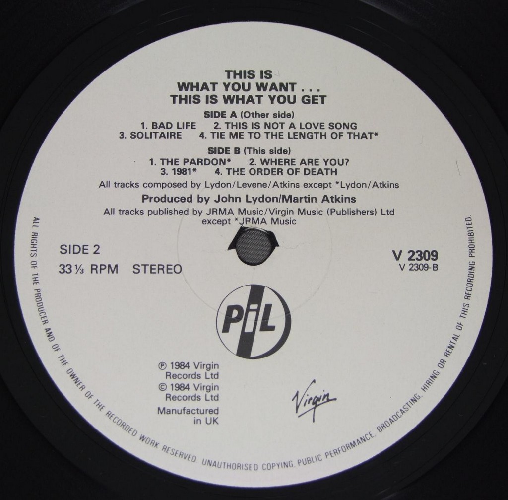 PUBLIC IMAGE/THIS IS WHAT YOU WANT V2309 製造国:英国盤 / Media:LPMatrix:A-1U-1-1 | B-3U-1-1外観:VG+盤の状態:EX- 価格(税込):¥2,200(売約済) 送料 7inch:定形外郵便 360円~LP:定形外郵便 660円~送料は、注文の最終画面で確認頂けます。 > > PUBLIC IMAGE/THIS IS WHAT YOU WANT 外観 (VG+)特記事項:背や上下ヘリスレやや有り。ジャケ表面は背等に薄いヨレシワが少しありますが、全体的にスレやスリキズ、よごれは少ない感じ。オリジナルインナーはヨレは少ない感じ。底抜け有りです。外観VG+の共通説明:ダメージやや有り。シミ、ヨゴレ、スレなど多少~やや多め。 盤の状態 (EX-)特記事項:薄いスリキズ、細かい表面スレ多少。殆どが軽微なものの様子です。曲間など、静かなところを中心に聴いて見ましたが、チリプチも少なめで音もしっかり鳴っているようでした。盤EX-の共通説明:盤面のスリキズが多少有り。音に出そうなものは殆ど無いように見える~さほど気にならないぐらいの軽いプチ数カ所程度。 Tweet それぞれの画像をクリックすると、大きい写真が見られます こちらの商品もお勧めです 1,980円 VARIOUS ARTISTS (GARDEN OF DELIGHTS PRESENTS ) / SEEK REFUGE FROM YOUR INTOLERABLE SITUATION 550円 FIRE FALL / UNDERTOW 1,980円 PRISONSHAKE / ROARING THIRD 990円 TUXEDOMOON / TIME TO LOSE-BLIND 660円 BRONSKI BEAT / HUNDREDS & THOUSANDS 770円 TOMMY TUTONE / TOMMY TUTONE 2 660円 THOMPSON TWINS / HERE`S TO FUTURE DAYS 990円 AND ALL BECAUSE THE LADY LOVES / ANYTHING BUT A SOFT CENTRE