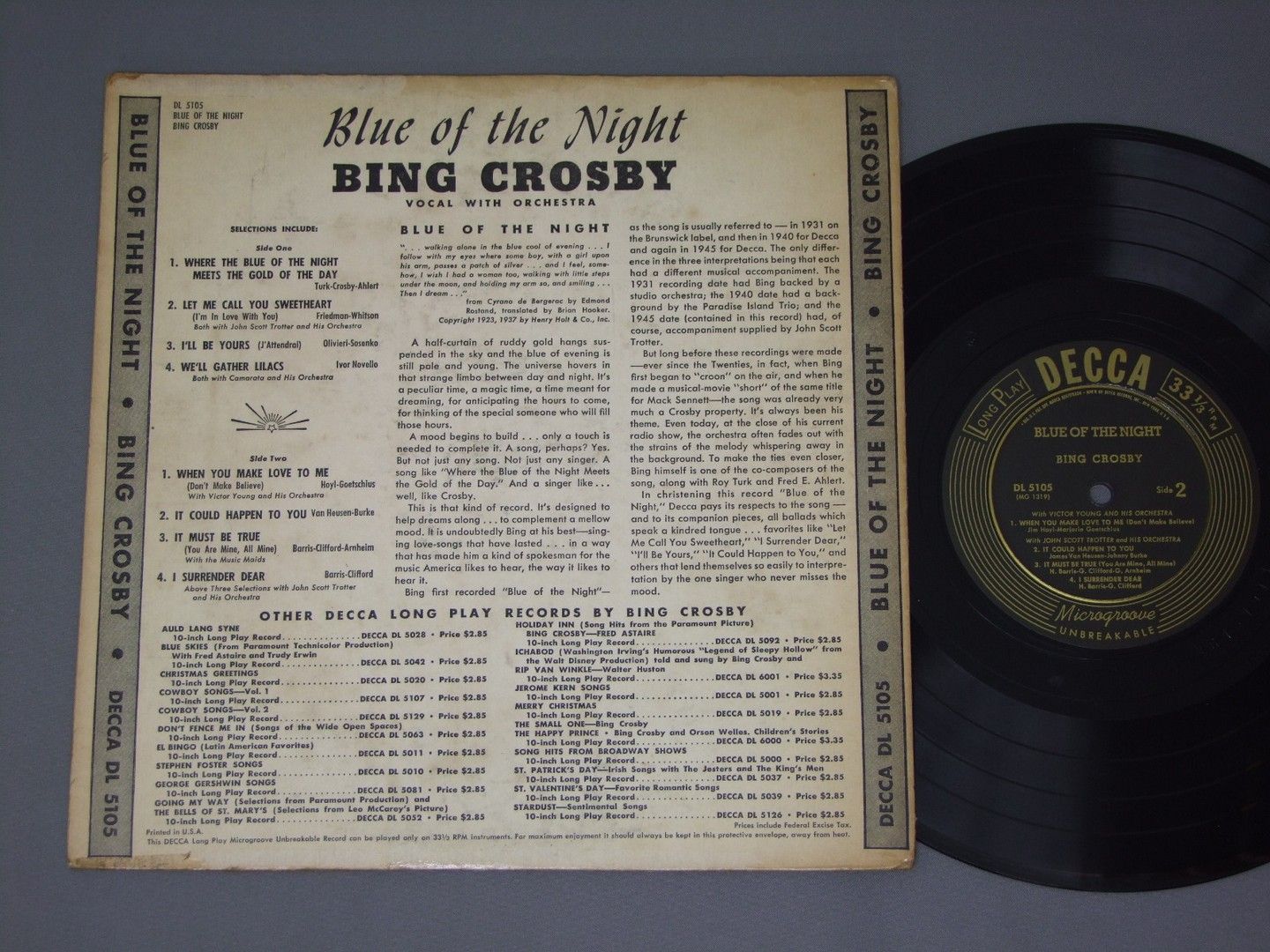 BING CROSBY/BLUE OF THE NIGHT DL5105 製造国:米国盤 / Media:10inc外観:VG+盤の状態:VG+ 価格(税込):¥2,096(売約済) 送料 7inch:定形外郵便 360円~LP:定形外郵便 660円~送料は、注文の最終画面で確認頂けます。 > > BING CROSBY/BLUE OF THE NIGHT 外観 (VG+)特記事項:角スレ有り。背、上下ヘリにスレとよごれ、割れの補修有り。表ジャケはレコード取り出し口付近と下ヘリに着色補修有り。スレやよごれ有り。裏ジャケはよごれ有り。外観VG+の共通説明:ダメージやや有り。シミ、ヨゴレ、スレなど多少~やや多め。 盤の状態 (VG+)特記事項:スリキズ、スレやや多め。プチ出そうな所はチラホラとある感じで、全体的には軽微なものが中心の様子です。モノ針で少し聴いてみましたがチリプチ多少、音自体はしっかりクリアーに鳴っているようです。盤VG+の共通説明:盤面にスリキズが多少~やや有り、音に出そうなものも多少ある。 Tweet それぞれの画像をクリックすると、大きい写真が見られます こちらの商品もお勧めです 990円 FRANKIE AVALON / YOU`RE MY LIFE 3,300円 ELVIS PLESLEY / ELVIS FOR PRESIDENT UNOFFICIAL RELEASE 1,320円 RAY CHARLES / FRIENDSHIP