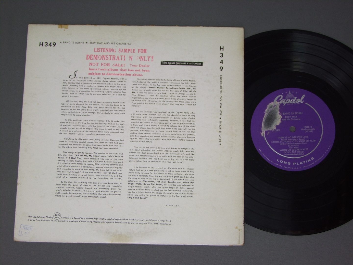 BILLY MAY/BAND IS BORN H349 製造国:米国盤 / Media:10inch外観:EX-盤の状態:VG+ 価格(税込):¥550(売約済) 送料 7inch:定形外郵便 360円~LP:定形外郵便 660円~送料は、注文の最終画面で確認頂けます。 レコード検索 > CLASSIC CHAMBER > BILLY MAY/BAND IS BORN 外観 (EX-)特記事項:底スレ多少有り。背はスレや薄いよごれ多少。上ヘリは割れの補修。表ジャケはスレやよごれは少ない感じ。左下辺りにステッカーの剥がし跡。裏ジャケはスレよごれ多少有りますが、全体的によごれは少ない感じです。上ヘリにテープ跡。NOT FOR SALEのスタンプ有り。外観EX-の共通説明:ダメージ軽度~多少。 中古品としては普通の状態。シミ、ヨゴレ、スレなど軽く~多少。 盤の状態 (VG+)特記事項:薄いスリキズ・スレなど軽く。プチ出そうな所も数カ所有りますが、全体的には、軽微なものが中心で、盤も黒さが残っている様子です。盤VG+の共通説明:盤面にスリキズが多少~やや有り、音に出そうなものも多少ある。 Tweet それぞれの画像をクリックすると、大きい写真が見られます こちらの商品もお勧めです 2,420円 HERBIE MANN & SAM MOST QUINTET / HERBIE MANN & SAM MOST QUINTET 1,210円 BOBBY HACKETT / BUTTERFLY AIRS VOLUME 1 SIR CHARLES AUTOGRAPHEDSIR CHARLESサイン付 1,210円 BUTCH THOMPSON - HAL SMITH & CHARLIE DEVORE / MILEMBERG JOYSCHARLIE DEVOREサイン付 1,100円 MODERN JAZZ QUARTET / LAST CONCERT 440円 FRANKIE CARLE / HONKY-TONK HITS BY THE DOZEN 770円 JIM GALLOWAY`S WEE BIG BAND / KEEP THE RHYTHM GOING 770円 COLMAN HAWKINS ROY ELDRIDGE PETE BROWN JO JONES ALL STARS / NEWPORT YEARS 660円 EDDIE CONDON / SUNNY DAYS