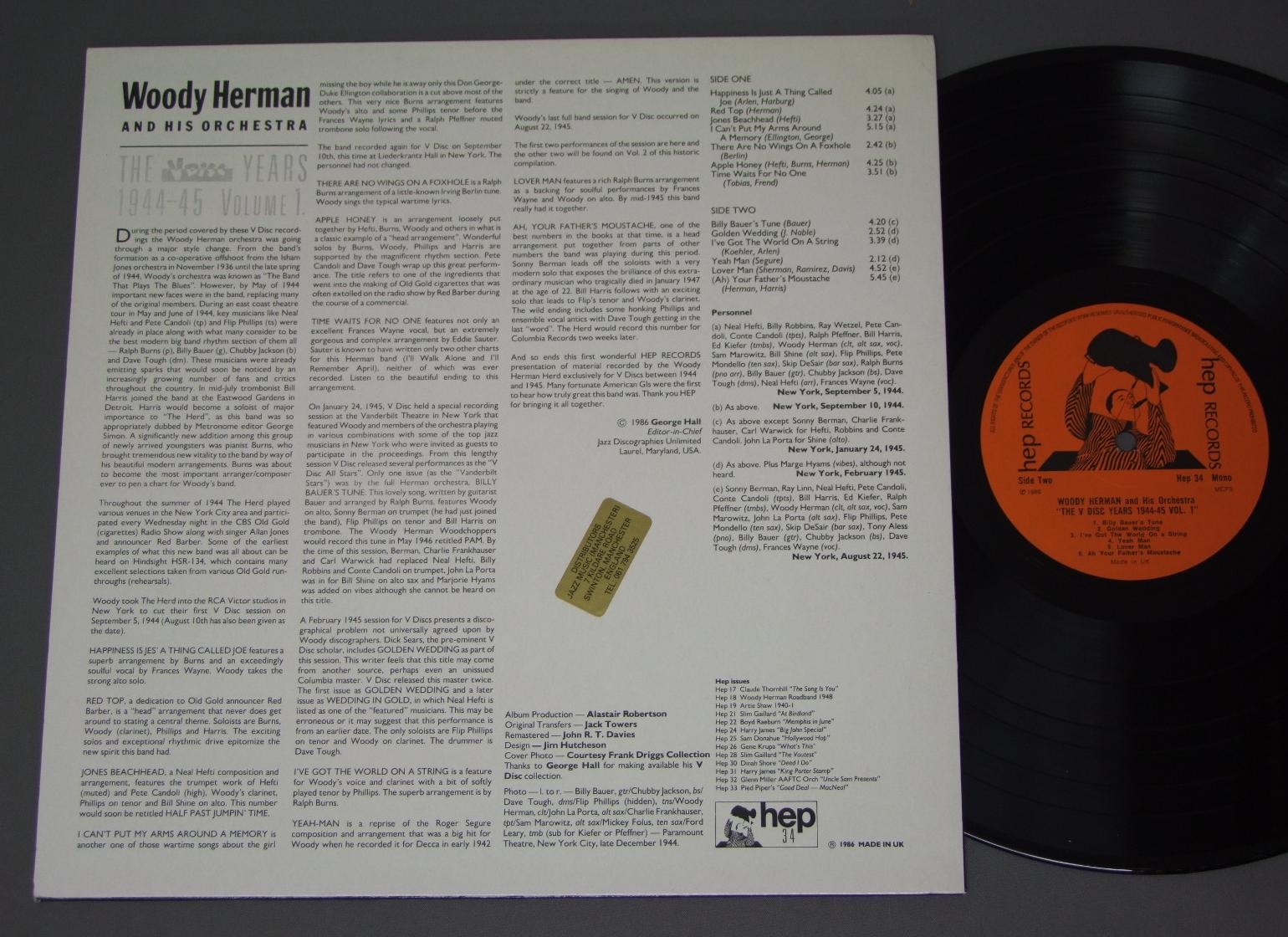 WOODY HARMAN AND HIS ORCHESTRA/V-DISC YEARS 1944-45 VOL1 HEP34 製造国:英国盤 / Media:LP外観:EX盤の状態:EX 価格(税込):¥770(売約済) 送料 7inch:定形外郵便 360円~LP:定形外郵便 660円~送料は、注文の最終画面で確認頂けます。 レコード検索 > CLASSIC CHAMBER > WOODY HARMAN AND HIS ORCHESTRA/V-DISC YEARS 1944-45 VOL1 外観 (EX)特記事項:角スレ少し。背上角にぶつかりヨレ小。ジャケ表面は表裏共に全体的にスレやスリキズ、よごれ等は少ない感じ。外観EXの共通説明:ダメージが限定的。中古品としては保存状態がよい方。シミ、ヨゴレ、スレ 少し~軽度。 盤の状態 (EX)特記事項:薄いスリキズ・スレ軽くある感じ。ほとんどが軽微なものの様子で、一見して中々きれいな印象です。盤EXの共通説明:盤面のスリキズが薄いものが少し~軽度 音に出そうなものは無いように見える(軽微なソフトティック音は除く)。 Tweet それぞれの画像をクリックすると、大きい写真が見られます こちらの商品もお勧めです 440円 EDDIE CONDON / SPIRIT OF CONDON 1,210円 SACKVILLE ALL STAR / CHRISTMAS RECORD (RALPH SUTTON AUTOGRAPHED)CHRISTMAS RECORD (RALPH SUTTONサイン付) 990円 SING MILLER / MORE OLD TIMES WITH SING MILLERJEFF HAMILTONサイン付 1,540円 LIONEL HAMPTON / LIONEL AT MARIBU BEACH 770円 JIM GALLOWAY`S WEE BIG BAND / KEEP THE RHYTHM GOING 770円 DIZZY GILLESPIE AND HIS ORCHESTRA / IMMORTAL SESSIONS 550円 GENE KRUPA / AT THE CLICK PHILADELPHIA 1947 1,210円 RALPH SUTTON etc / JAZZ IN THE TROC(RALPH SUTTON AUTOGRAPHED)JAZZ IN THE TROC(RALPH SUTTONサイン付)
