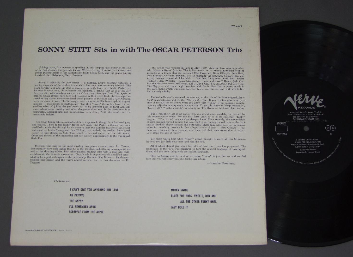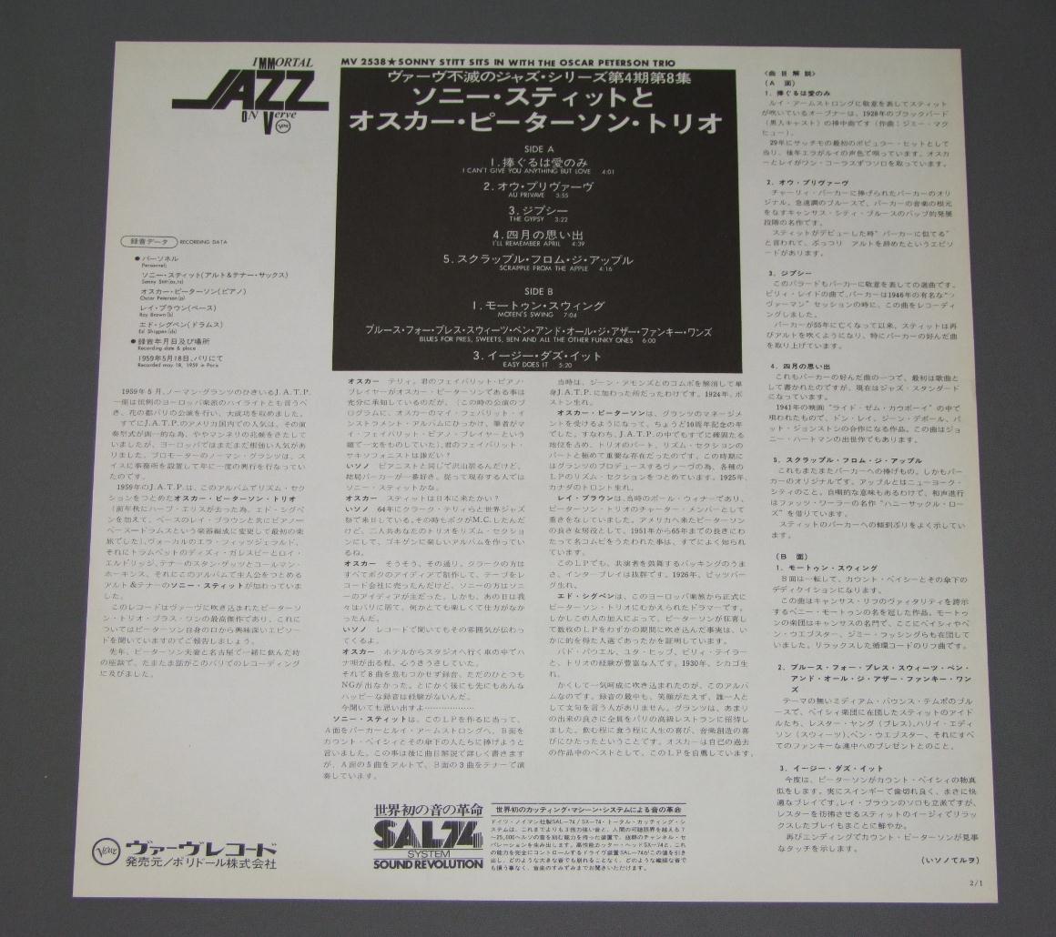 SONNY STITT/SITS IN WITH THE OSCAR PETERSON TRIO MV2538 製造国:日本盤 / Media:LP外観:EX盤の状態:EX+ 価格(税込):¥943(売約済) 送料 7inch:定形外郵便 360円~LP:定形外郵便 660円~送料は、注文の最終画面で確認頂けます。 > > SONNY STITT/SITS IN WITH THE OSCAR PETERSON TRIO 外観 (EX)特記事項:底ヘリの両角にぶつかりヨレが僅かに有り。ジャケ表面は薄いレコードリングスレ等スレよごれ軽多少有りますが、全体的にスリキズやよごれ等は少ない感じ。外観EXの共通説明:ダメージが限定的。中古品としては保存状態がよい方。シミ、ヨゴレ、スレ 少し~軽度。 盤の状態 (EX+)特記事項:極薄いスリキズ・スレ少しだけ。一見してきれいな状態です。盤EX+の共通説明:盤面の極薄いスリキズ、スレ少し程度 音に出そうなものは無いように見える(極軽微なソフトティック音は除く)。 その他: ※画像では確認できない、上下ヘリ、背表紙、取り出し口を中心に状態表記しております。画像で確認出来る表裏ジャケ、レーベルの状態表記は省いている場合がありますので、そちらの状態は画像でご確認をお願い致します。携帯の方は一度PC等で写真をご確認の上ご入札下さいますよう、お願い申し上げます。 Tweet それぞれの画像をクリックすると、大きい写真が見られます こちらの商品もお勧めです 1,210円 EDDIE CONDON & OTHERSエディ・コンドン・アンド・アザーズ / CHICAGO&ALL THAT JAZZ!シカゴ・アンド・オール・ザット・ジャズ! 660円 EDDIE HEYWOOD / TOUCH OF EDDIE HEYWOOD 1,210円 WILLIE SMITH - JESS STACY - JOE SULLIVANジェス・ステイシー - ウィリイ・スミス - ジョー・サリバン / CHAIRMEN OF THE BOARD VOL2ピアノ・ジャズの競演 第2集 1,210円 BUCK CLAYTONバック・クレイトン / PASSORT TO PARADISEスポート・トゥ・パラダイス 660円 KAZUMI BAND香津美バンド / TALK YOU ALL TIGHT頭狂好児唐眼 2,640円 EDDIE CONDON ALL STARSエディ・コンドン・オール・スターズ / EDDIE CONDON ALL STARS 1945 5LP BOX SETエディ・コンドン・オール・スターズ1945 5枚組 440円 JONES BOYS / WHOLE TOWN`S TALKING ABOUT 1,320円 CHARLIE MINGUSチャーリー・ミンガス / PITHECANTHROPUS ERECTUS直立猿人