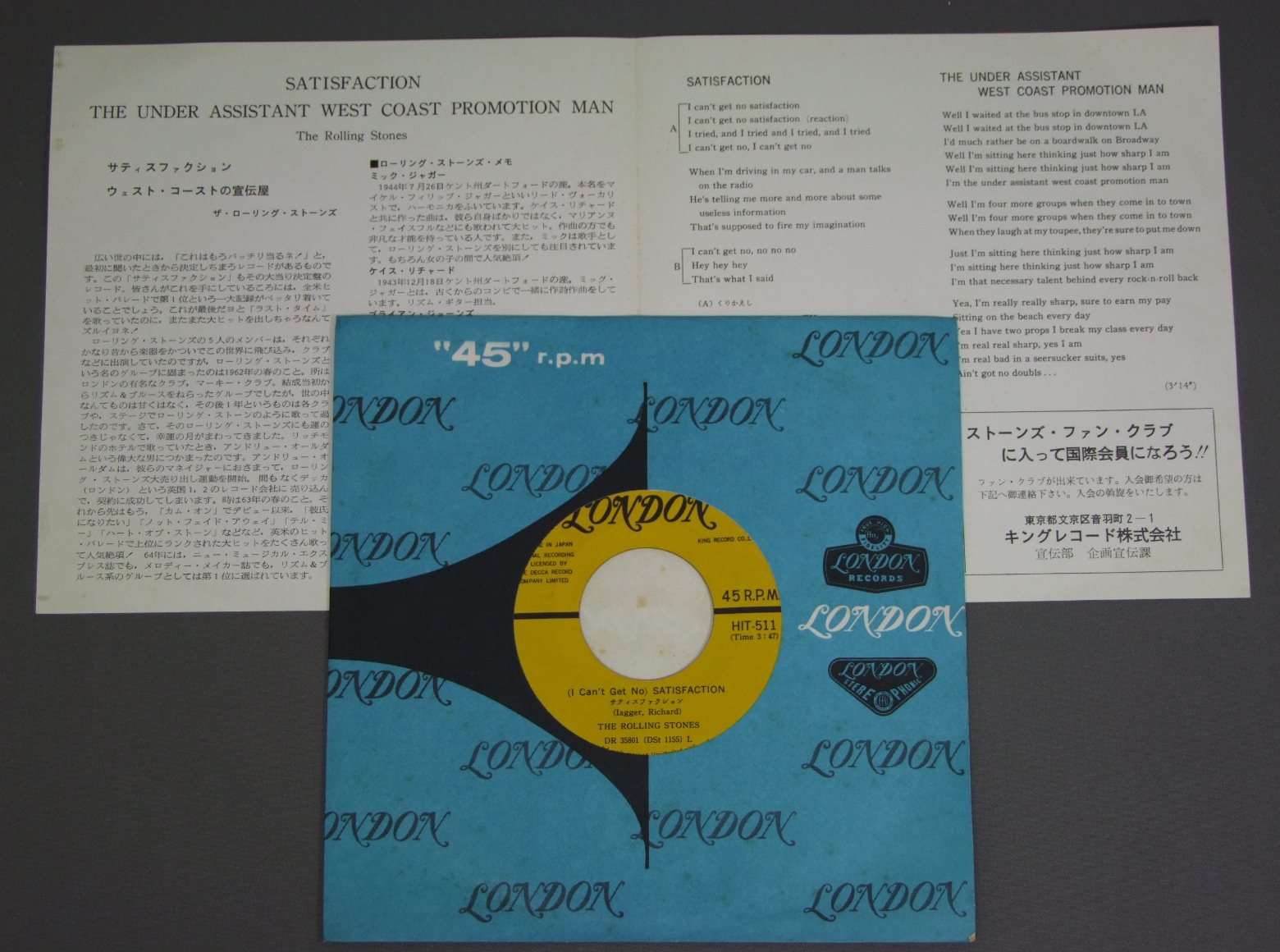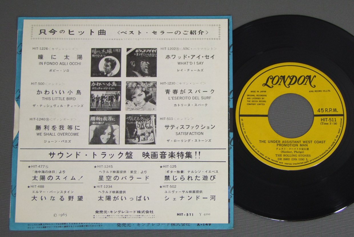 ROLLING STONES/SATISFACTION HIT511 製造国:日本盤 / Media:7inch外観:EX+盤の状態:EX+ 価格(税込):¥2,619(売約済) 送料 7inch:定形外郵便 360円~LP:定形外郵便 660円~送料は、注文の最終画面で確認頂けます。 > > ROLLING STONES/SATISFACTION 外観 (EX+)特記事項:ヨレやよごれのあまり無いきれいな状態。外観EX+の共通説明:中古としては美品、一見してきれいでダメージが軽微。シミ、ヨゴレ、スレ有っても僅か~少し。 盤の状態 (EX+)特記事項:薄いスリキズ・スレ少し。一見してきれいな状態です。盤EX+の共通説明:盤面の極薄いスリキズ、スレ少し程度 音に出そうなものは無いように見える(極軽微なソフトティック音は除く)。 その他: ※画像では確認できない、上下ヘリ、背表紙、取り出し口を中心に状態表記しております。画像で確認出来る表裏ジャケ、レーベルの状態表記は省いている場合がありますので、そちらの状態は画像でご確認をお願い致します。携帯の方は一度PC等で写真をご確認の上ご入札下さいますよう、お願い申し上げます。 Tweet それぞれの画像をクリックすると、大きい写真が見られます こちらの商品もお勧めです 770円 MICK JAGGERミック・ジャガー / SHE`S THE BOSSシーズ・ザ・ボス