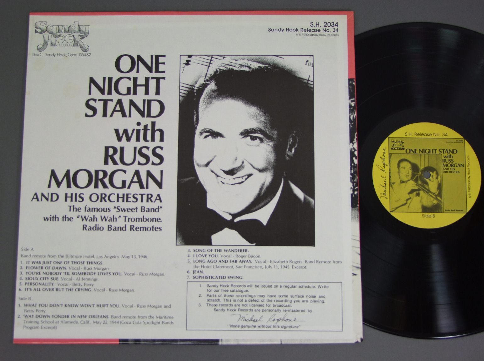 RUSS MORGAN AND HIS ORCHESTRA/ONE NIGHT STAND SH2034 製造国:輸入盤 / Media:LP外観:EX盤の状態:EX+ 価格(税込):¥550(売約済) 送料 7inch:定形外郵便 360円~LP:定形外郵便 660円~送料は、注文の最終画面で確認頂けます。 レコード検索 > CLASSIC CHAMBER > RUSS MORGAN AND HIS ORCHESTRA/ONE NIGHT STAND 外観 (EX)特記事項:裏ジャケに薄いシミが少しありますが、ジャケ表面は全体的にスレやスリキズ、よごれ等は薄い感じ。外観EXの共通説明:ダメージが限定的。中古品としては保存状態がよい方。シミ、ヨゴレ、スレ 少し~軽度。 盤の状態 (EX+)特記事項:極薄いスリキズ・スレ少し。一見してきれいな状態です。盤EX+の共通説明:盤面の極薄いスリキズ、スレ少し程度 音に出そうなものは無いように見える(極軽微なソフトティック音は除く)。 Tweet それぞれの画像をクリックすると、大きい写真が見られます こちらの商品もお勧めです 990円 SING MILLER / MORE OLD TIMES WITH SING MILLERJEFF HAMILTONサイン付 1,540円 PETER NERO / HAIL THE CONQUERING NERO 1,210円 PETER SPRAGUE / MUSICA DEL MAR 1,650円 BILLY BYERS`BIG BAND / TAKE THE DUKE`S TRAIN 660円 EDDIE CONDON / SUNNY DAYS 880円 CHARLIE MINGUS / PREBIRD 1,320円 EDMUND HALL VIC DICKSON etc / DIXIELAND MAIN STEM NEW ORLEANS 770円 BOB WILBER / DIZZYFINGERS