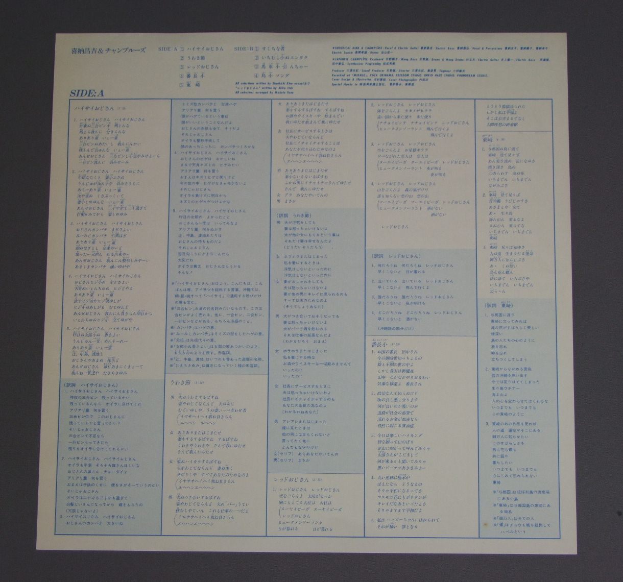 SHOUKICHI KINA喜納昌吉&チャンプルズ/1st ALBUM S7025 製造国:日本盤 / Media:LP外観:EX-盤の状態:EX+帯:EX 価格(税込):¥1,885(売約済) 送料 7inch:定形外郵便 360円~LP:定形外郵便 660円~送料は、注文の最終画面で確認頂けます。 > > SHOUKICHI KINA/1st ALBUM 外観 (EX-)特記事項:裏ジャケにシミ軽有りますが、ジャケ表面は全体的にスレやスリキズ、よごれ等は薄い感じ。外観EX-の共通説明:ダメージ軽度~多少。 中古品としては普通の状態。シミ、ヨゴレ、スレなど軽く~多少。 盤の状態 (EX+)特記事項:極薄いスリキズ・スレ少しだけ。一見してきれいな状態です。盤EX+の共通説明:盤面の極薄いスリキズ、スレ少し程度 音に出そうなものは無いように見える(極軽微なソフトティック音は除く)。 帯の状態 (EX):ヨレやよごれ等は少ない感じ。 その他: ※画像では確認できない、上下ヘリ、背表紙、取り出し口を中心に状態表記しております。画像で確認出来る表裏ジャケ、レーベルの状態表記は省いている場合がありますので、そちらの状態は画像でご確認をお願い致します。携帯の方は一度PC等で写真をご確認の上ご入札下さいますよう、お願い申し上げます。 Tweet それぞれの画像をクリックすると、大きい写真が見られます こちらの商品もお勧めです 440円 MARI AMACHI天地真理 / BRIDGE OF A RAINBOW虹をわたって 1,320円 JUN & NENEじゅん&ネネ / WORLD OF JUN & NENE愛するってこわい -じゅん&ネネの世界- 660円 MASAMICHI SUGI杉真理 / SYMPHONY #10シンフォニー10 770円 TAKURO YOSHIDA吉田拓郎 / OHINARU HITO大いなる人 770円 YOSUI INOUE井上陽水 / YOSUI 2 ( SENTIMENTAL )陽水?センチメンタル 1,210円 SHOGO HAMADA浜田省吾 / GATE OF THE PROMISED LANDプロミスト・ランド -約束の地 440円 AMII OZAKI尾崎亜美 / SHOT 770円 NOBODYノーバディ / RESTLESS HEARTレストレス・ハート