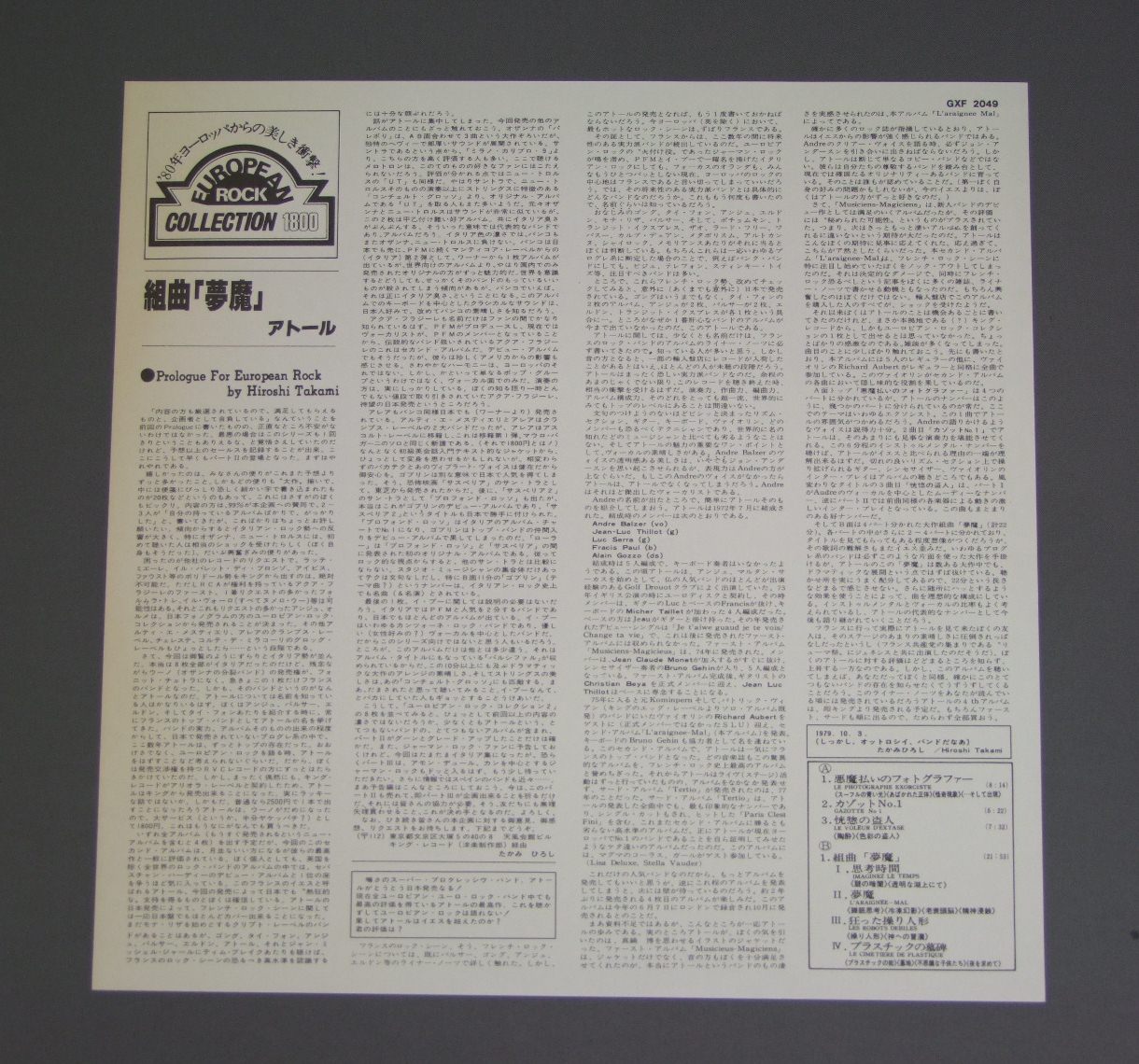 ATOLL/L`ARAIGNEE-MAL組曲夢魔 GXF2049 製造国:日本盤 / Media:LP外観:EX盤の状態:EX+ 価格(税込):¥838(売約済) 送料 7inch:定形外郵便 360円~LP:定形外郵便 660円~送料は、注文の最終画面で確認頂けます。 > > ATOLL/L`ARAIGNEE-MAL 外観 (EX)特記事項:表裏ジャケ共に背側に薄い日焼け感有り。ジャケ表面は全体的にスレやスリキズ、よごれ等は薄い感じ。外観EXの共通説明:ダメージが限定的。中古品としては保存状態がよい方。シミ、ヨゴレ、スレ 少し~軽度。 盤の状態 (EX+)特記事項:極薄いスリキズ・スレ少しだけ。一見してきれいな状態です。盤EX+の共通説明:盤面の極薄いスリキズ、スレ少し程度 音に出そうなものは無いように見える(極軽微なソフトティック音は除く)。 その他: ※画像では確認できない、上下ヘリ、背表紙、取り出し口を中心に状態表記しております。画像で確認出来る表裏ジャケ、レーベルの状態表記は省いている場合がありますので、そちらの状態は画像でご確認をお願い致します。携帯の方は一度PC等で写真をご確認の上ご入札下さいますよう、お願い申し上げます。 Tweet それぞれの画像をクリックすると、大きい写真が見られます こちらの商品もお勧めです 1,210円 RICK WAKEMAN - THE LONDON SYMPHONY ORCHESTRAリック・ウェイクマン - ロンドン交響楽団 / JOURNY TO THE CENTER OF THE EARTH地底探検 1,210円 RICK WAKEMANリック・ウェイクマン / JOURNEY TO THE CENTER OF THE EARTH地底探検 ライブ 770円 EMERSON LAKE & PALMERエマーソン・レイク&パーマー / PICTURES AT AN EXHIBITION展覧会の絵 770円 EMERSON LAKE & PALMERエマーソン・レイク&パーマー / IN CONCERT 770円 ASIAエイジア / 1st ALBUM詠時感(エイジア) 880円 ASIAエイジア / ALPHAアルファ 770円 ASIAエイジア / ALFHAアルファ 990円 UKUK / UK憂国の四士