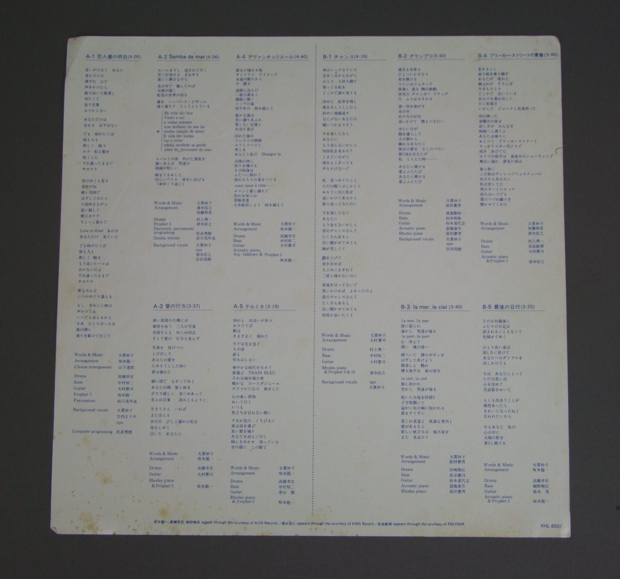 TAEKO OHNUKI大貫妙子/AVENTURE RHL8507 製造国:日本盤 / Media:LP外観:EX-盤の状態:EX 価格(税込):¥440(売約済) 送料 7inch:定形外郵便 360円~LP:定形外郵便 660円~送料は、注文の最終画面で確認頂けます。 > > TAEKO OHNUKI/AVENTURE 外観 (EX-)特記事項:ジャケ表面は全体的にスレやスリキズ、よごれ等は薄い感じ。外観EX-の共通説明:ダメージ軽度~多少。 中古品としては普通の状態。シミ、ヨゴレ、スレなど軽く~多少。 盤の状態 (EX)特記事項:薄いスリキズ・スレ軽くある感じ。ほとんどが軽微なものの様子で、なかなかきれいな印象です。盤EXの共通説明:盤面のスリキズが薄いものが少し~軽度 音に出そうなものは無いように見える(軽微なソフトティック音は除く)。 その他: ※画像では確認できない、上下ヘリ、背表紙、取り出し口を中心に状態表記しております。画像で確認出来る表裏ジャケ、レーベルの状態表記は省いている場合がありますので、そちらの状態は画像でご確認をお願い致します。携帯の方は一度PC等で写真をご確認の上ご入札下さいますよう、お願い申し上げます。 Tweet それぞれの画像をクリックすると、大きい写真が見られます こちらの商品もお勧めです 770円 EMU絵夢 / EMU 2絵夢 II 990円 AMII OZAKI尾崎亜美 / POINTS 1,210円 SHOGO HAMADA浜田省吾 / GATE OF THE PROMISED LANDプロミスト・ランド -約束の地 2,200円 ALFEEアルフィー / MASTAER SOUND PRESSINGザ・ルネッサンス MASTER SOUND盤 1,210円 YOUSUI INOUE井上陽水 / SHOW WITHOUT INVITATION招待状のないショー。 660円 KENICHI HAGIWARA萩原健一 / NADJAナジャ 880円 ITOH YUKARI伊東ゆかり / YUKARIゆかり 770円 S.KIYOTAKA & OMEGA TRIBE杉山清貴 & オメガドライブ / LIVE EMOTIONライヴ・エモーション