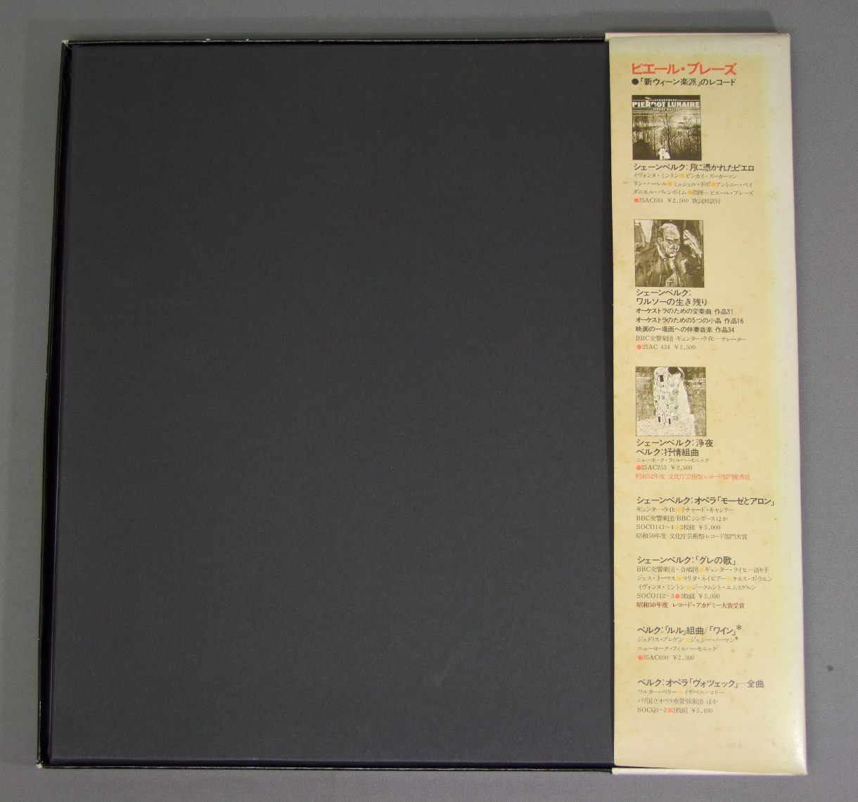 BOULEZブーレーズ/ウェーベルン全集 00AC778-781 製造国:日本盤 / Media:LP外観:EX盤の状態:EX+帯:VG+ 価格(税込):¥1,870(売約済) 送料 7inch:定形外郵便 360円~LP:定形外郵便 660円~送料は、注文の最終画面で確認頂けます。 > > BOULEZ/ 外観 (EX)特記事項:箱はヘリや角でスレが少し。箱表面は表面は全体的にスレやスリキズ、よごれ等は薄い感じ。表箱裏はシミ有り。ブックレットはあまりヨレやよごれ等は無い感じ。外観EXの共通説明:ダメージが限定的。中古品としては保存状態がよい方。シミ、ヨゴレ、スレ 少し~軽度。 盤の状態 (EX+)特記事項:極薄いスリキズ・スレ少し。一見してきれいな状態です。音にでそうなものはほぼ無く、有ってもソフトティック少し程度でしょう。盤EX+の共通説明:盤面の極薄いスリキズ、スレ少し程度 音に出そうなものは無いように見える(極軽微なソフトティック音は除く)。 帯の状態 (VG+):ヨレは少ない感じですが背や付近で日焼け退色。シミも多少有り。 その他:4枚組 ※画像では確認できない、上下ヘリ、背表紙、取り出し口を中心に状態表記しております。画像で確認出来る表裏ジャケ、レーベルの状態表記は省いている場合がありますので、そちらの状態は画像でご確認をお願い致します。携帯の方は一度PC等で写真をご確認の上ご入札下さいますよう、お願い申し上げます。 Tweet それぞれの画像をクリックすると、大きい写真が見られます こちらの商品もお勧めです 990円 BERNSTEINバーンステイン / TCHAIKOVSKY-PATHETIQUE SYM.チャイコフスキー-悲愴 990円 MUNCHINGERミュンヒンガー / SCHUBERT-ROSAMUNDEシューベルト-ロザムンデ(魔法の竪琴) 序曲 990円 MONTEUXピエール・モントゥー-メータ 他 / VIENNA PHILHARMONIC&20 GREAT CONDUCTORSウィーン・フィルハーモーニーと20人の偉大な指揮者たち 770円 ORMANDY - PHILADELPHIA ORCH.オーマンディ - フィラデルフィア管弦楽団 / ROMANTIC PHILADELPHIA STRINGSストリングス・コンサート 1,320円 YEPES - THE NATIONAL ORCHESTRA OF SPAINイエペス - スペイン国立管弦楽団 / CONCERTO DE ARANJUEZアランフェス協奏曲 990円 KARAJAN-BOHM etcカラヤン-ベーム 他 / R.STRAUSS-EIN HELDEN LEBENR.シュトラウス-交響詩 英雄の生涯-交響詩 ツァラトゥストラはかく語りき 990円 MUNCHシャルル・ミュンシュ / BEETHOVEN-SYM. NO3 EROICAベートーヴェン-交響曲 第3番 英雄 1,320円 KARAJANカラヤン / HIFI KARAJANハイファイ・カラヤン