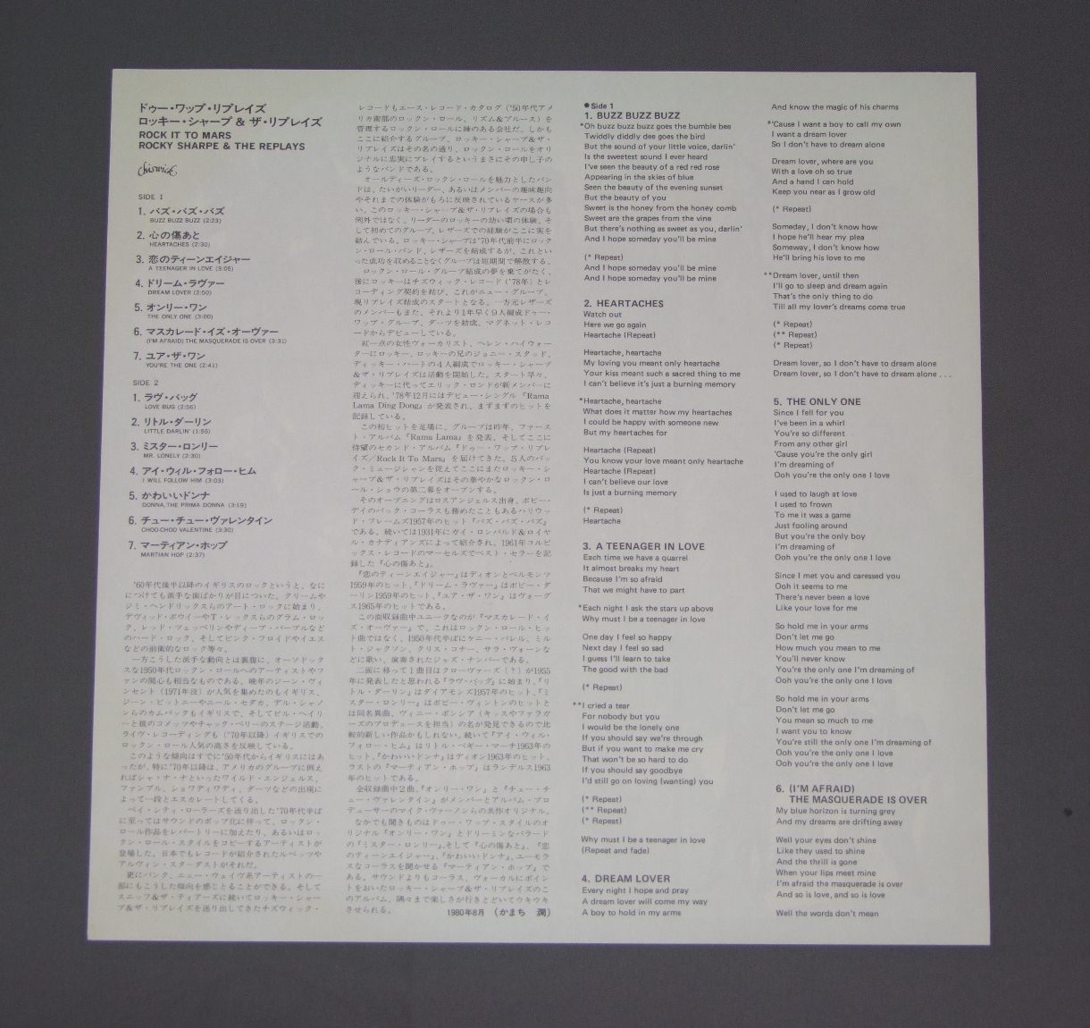 ROCKY SHARPE AND THE REPLAYS /ROCK IT TO MARS P10923Z 製造国:日本盤 / Media:LP外観:EX+盤の状態:EX+帯:EX+ 価格(税込):¥1,047(売約済) 送料 7inch:定形外郵便 360円~LP:定形外郵便 660円~送料は、注文の最終画面で確認頂けます。 レコード検索 > 全てのジャンル > ROCKY SHARPE AND THE REPLAYS /ROCK IT TO MARS 外観 (EX+)特記事項:ジャケ表面は全体的にスレやスリキズ、よごれ等はあまり無い感じ。外観EX+の共通説明:中古としては美品、一見してきれいでダメージが軽微。シミ、ヨゴレ、スレ有っても僅か~少し。 盤の状態 (EX+)特記事項:極薄いスリキズ・スレ少し。一見してきれいな状態です。盤EX+の共通説明:盤面の極薄いスリキズ、スレ少し程度 音に出そうなものは無いように見える(極軽微なソフトティック音は除く)。 帯の状態 (EX+):あまりヨレやよごれなどは無い感じ。 その他:見本盤 | ※画像では確認できない、上下ヘリ、背表紙、取り出し口を中心に状態表記しております。画像で確認出来る表裏ジャケ、レーベルの状態表記は省いている場合がありますので、そちらの状態は画像でご確認をお願い致します。携帯の方は一度PC等で写真をご確認の上ご入札下さいますよう、お願い申し上げます。 Tweet それぞれの画像をクリックすると、大きい写真が見られます こちらの商品もお勧めです 1,210円 ULTRAVOXウルトラヴォックス / NEW EUROPEANS新欧州人 1,320円 BLONDIEブロンディ / AUTOAMERICANオート・アメリカン 880円 SNIFF `N` THE TEARSスニッフ&ザ・ティアーズ / LOVE ACTION夜の眩暈 1,210円 HARDCHOIRハードクワイア / HARDCHOIR華麗なる戦慄 770円 ADAM AND THE ANTS / KINGS OF THE WILD FRONTIER 1,320円 KEVIN ROWL & DEXYS MIDNIGHT RUNNERSテキシーズ・ミッドナイト・ランナーズ / TOO-RYE-AY女の泪はワザモンだ!! 1,320円 DOOL BY DOOLドール・バイ・ドール / GYPSY BLOODジプシー・ブラッド 1,320円 ADAM AND THE ANTSアダム&ジ・アンツ / KINGS OF THE WILD FRONTIERアダムの王国
