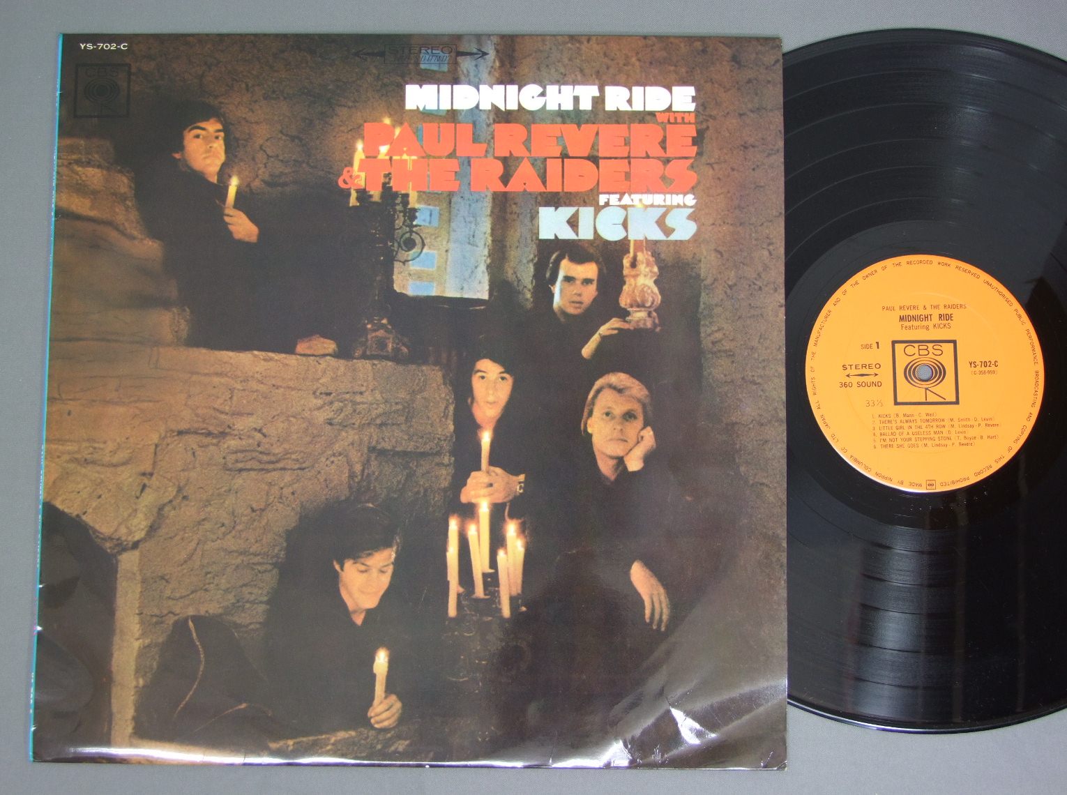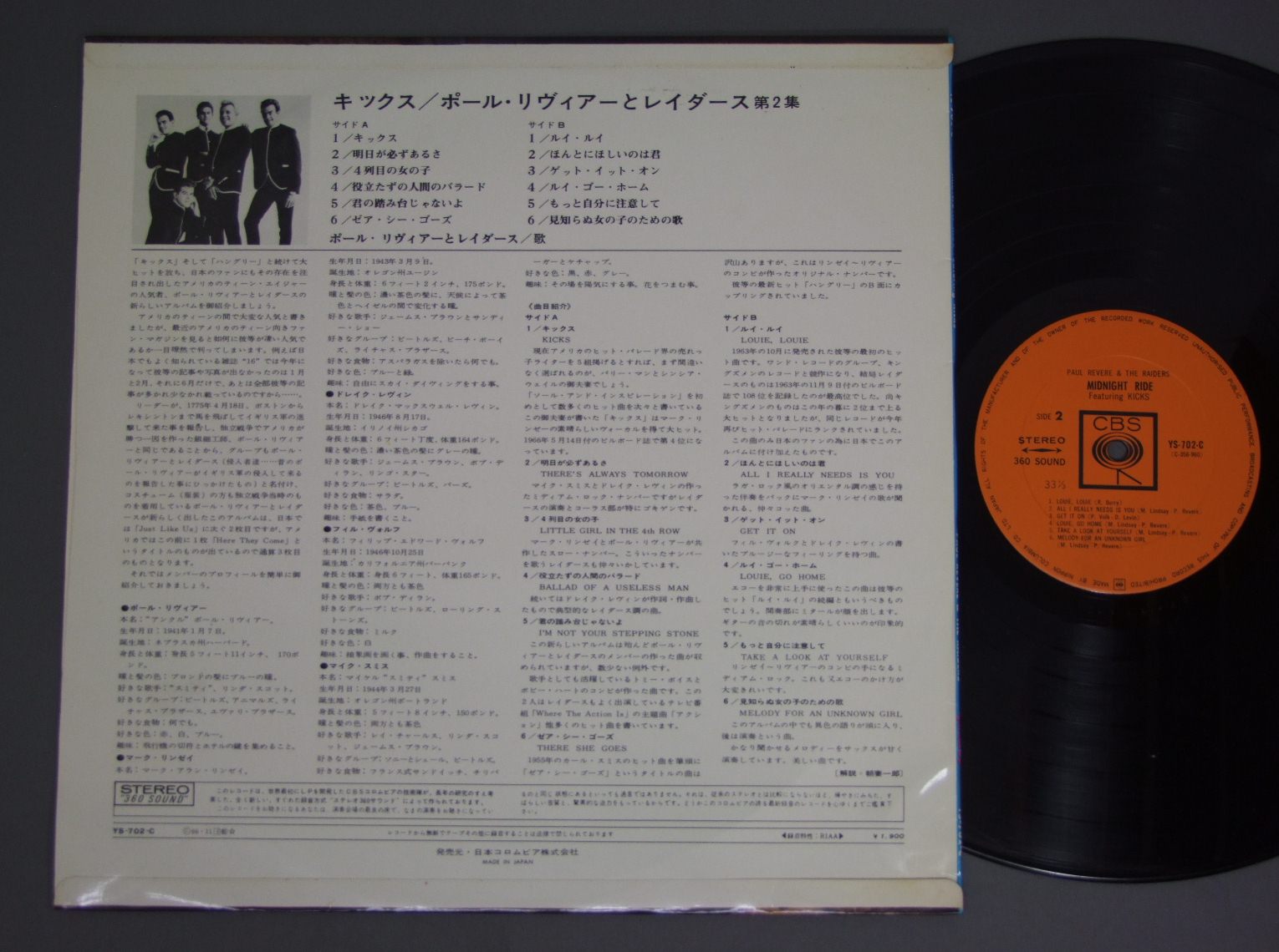 PAUL REVERE AND THE RAIDERSポール・リビアとレイダース/MIDNIGHT RIDE FEATURING KICKS第二集 ペラジャケ YS702C 製造国:日本盤 / Media:LP外観:EX+盤の状態:EX- 価格(税込):¥3,143(売約済) 送料 7inch:定形外郵便 360円~LP:定形外郵便 660円~送料は、注文の最終画面で確認頂けます。 > > PAUL REVERE AND THE RAIDERS/MIDNIGHT RIDE FEATURING KICKS 外観 (EX+)特記事項:底ヘリにドットスレ一箇所。レコード取り出し口下角でヨレが少し。ジャケ表面は全体的にスレやスリキズ、よごれ等は少ない感じ。解説カードにシミが少々。外観EX+の共通説明:中古としては美品、一見してきれいでダメージが軽微。シミ、ヨゴレ、スレ有っても僅か~少し。 盤の状態 (EX-)特記事項:薄いスリキズ・細かい表面スレ軽くある感じ。プチ出そうな所はも少し、全体的には殆どが軽微なものの様子です。盤EX-の共通説明:盤面のスリキズが多少有り。音に出そうなものは殆ど無いように見える~さほど気にならないぐらいの軽いプチ数カ所程度。 その他:※画像では確認できない、上下ヘリ、背表紙、取り出し口を中心に状態表記しております。画像で確認出来る表裏ジャケ、レーベルの状態表記は省いている場合がありますので、そちらの状態は画像でご確認をお願い致します。携帯の方は一度PC等で写真をご確認の上ご入札下さいますよう、お願い申し上げます。 Tweet それぞれの画像をクリックすると、大きい写真が見られます こちらの商品もお勧めです 2,640円 SPOTNICKSスプートニクス / KARELIA-THE BEST OF THE SPOTNICKS霧のカレリア-ベスト・オブ・ザ・スプートニクス 4,950円 ANIMALSアニマルズ / BEST ALBUM アニマルズのすべて 赤盤