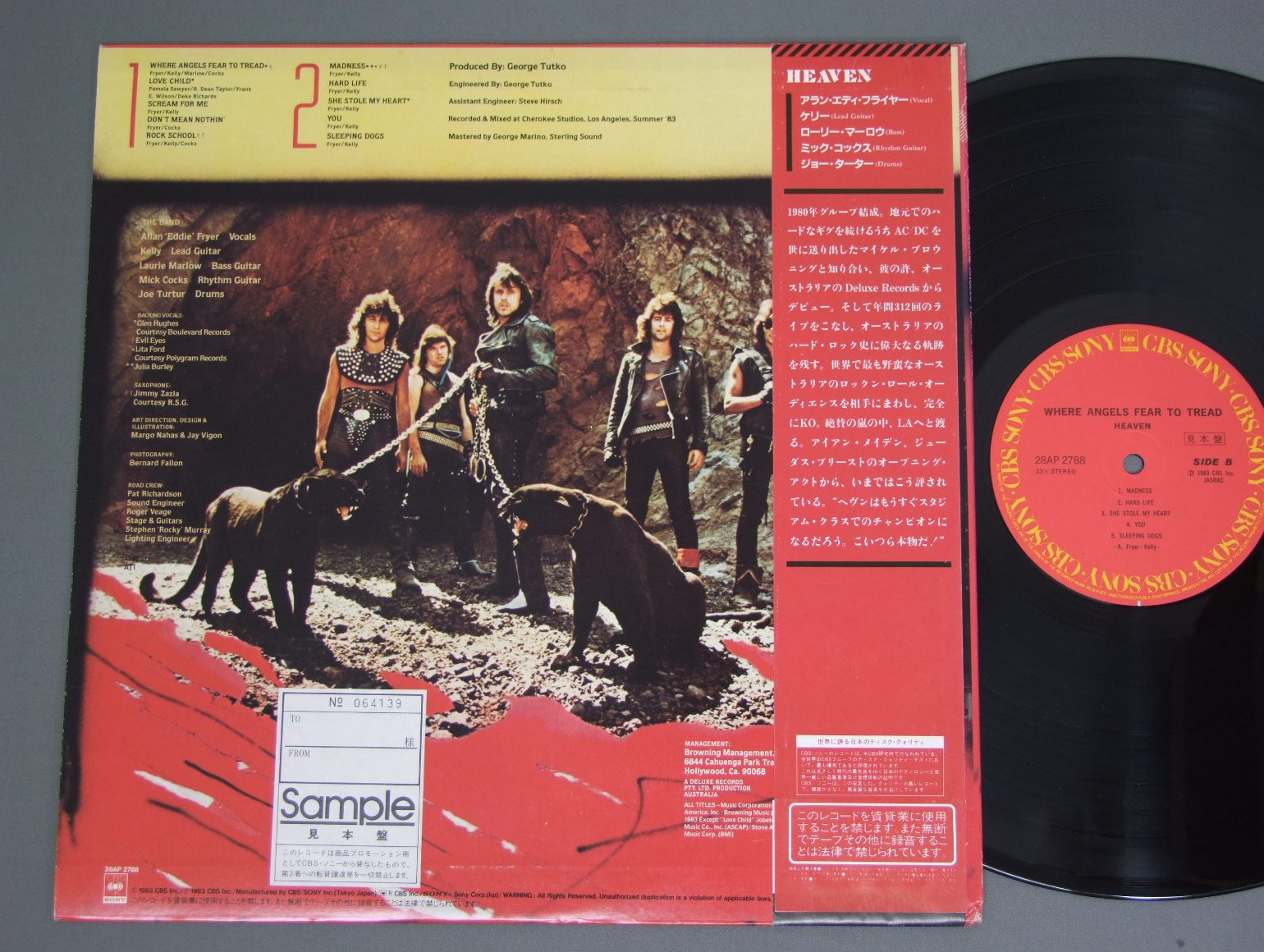 HEAVEN/WHERE ANGLES FEAR TO TREAD暴力教室 28AP2788 製造国:日本盤 / Media:LP外観:EX盤の状態:EX+帯:EX- 価格(税込):¥1,100(売約済) 送料 7inch:定形外郵便 360円~LP:定形外郵便 660円~送料は、注文の最終画面で確認頂けます。 > > HEAVEN/WHERE ANGLES FEAR TO TREAD 外観 (EX)特記事項:背下角でヨレ有り。ジャケ表面は全体的にスレやスリキズ、よごれ等は少ない感じ。外観EXの共通説明:ダメージが限定的。中古品としては保存状態がよい方。シミ、ヨゴレ、スレ 少し~軽度。 盤の状態 (EX+)特記事項:極薄いスリキズ・スレ少し。一見してきれいな状態です。盤EX+の共通説明:盤面の極薄いスリキズ、スレ少し程度 音に出そうなものは無いように見える(極軽微なソフトティック音は除く)。 帯の状態 (EX-):あまりヨレは無い感じですが、表側上の方に切れとヨレ、下の方にスレ有り。 その他:見本盤 Tweet それぞれの画像をクリックすると、大きい写真が見られます こちらの商品もお勧めです 660円 BERLIN / COUNT THREE & PRAY 770円 MONTROSEモントローズ / WARNER BROS PRESENTS MONTROSEワーナー・ブラザース・プレゼンツ・モントローズ 1,320円 RUSSIA露西亜 / RUSSIA露西亜 `ペテルスブルグ炎上` 770円 MICHAEL SCHENKER GROUPマイケル・シェンカー・グループ / CRY FOR THE NATIONSハーフ・ライブ 1,320円 NIGHT RANGERナイト・レンジャー / MIDNIGHT MADNESSミッドナイト・マッドネス 1,210円 NIGHT RANGERナイト・レンジャー / MIDNIGHT MADNESSナイト・レンジャー 990円 ANGELエンジェル / ANGEL天使の美学 770円 IAN GILLAN BANDイアン・ギラン・バンド / LIVE AT THE BUDOKANライブ・イン・ジャパン