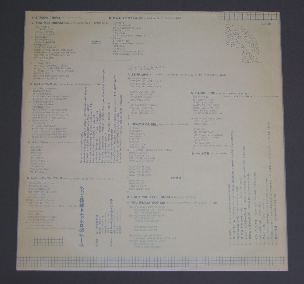 SEENA AND THE ROKKETS/真空パック ALR6023 製造国:日本盤 / Media:LP外観:EX盤の状態:EX+帯:EX+ 価格(税込):¥440(売約済) 送料 7inch:定形外郵便 360円~LP:定形外郵便 660円~送料は、注文の最終画面で確認頂けます。 > > SEENA AND THE ROKKETS/ 外観 (EX)特記事項:裏ジャケのレコード取り出し口側に薄いシミ多少ありますが、ジャケ表面は全体的にスレやスリキズ、よごれ等は薄い感じ。オリジナルインナーは多少日焼け感有る感じですが、ヨレやよごれ等はあまり無い感じ。抜けも無いです。外観EXの共通説明:ダメージが限定的。中古品としては保存状態がよい方。シミ、ヨゴレ、スレ 少し~軽度。 盤の状態 (EX+)特記事項:極薄いスリキズ・スレ少し。一見してきれいな状態です。盤EX+の共通説明:盤面の極薄いスリキズ、スレ少し程度 音に出そうなものは無いように見える(極軽微なソフトティック音は除く)。 帯の状態 (EX+):あまりヨレやよごれ等は無い感じ。 Tweet それぞれの画像をクリックすると、大きい写真が見られます こちらの商品もお勧めです 770円 COOLSクールス / ROCK`N`ROLL ANGELSロックン・ロール・エンジェルス 3,080円 JAPANES HEAVY METAL BANDS5th JAPAN HEAVY METAL FANTASY ( 1983 ) / 5th JAPAN HEAVY METAL FANTASY ( 1983 )グランド・メタル・ライヴ 1,320円 GERARDジェラルド / GERARDジェラルド 1,210円 LOUDNESSラウドネス / RISKY WOMANリスキー・ウーマン 1,320円 EARTH SHAKER / OVER RUN w/POST CARDS 1,320円 BOOWY / DAKARA 1,650円 NICOTINEニコチン / CARNIVAL未開封 1,320円 EARTH SHAKER / PASSION