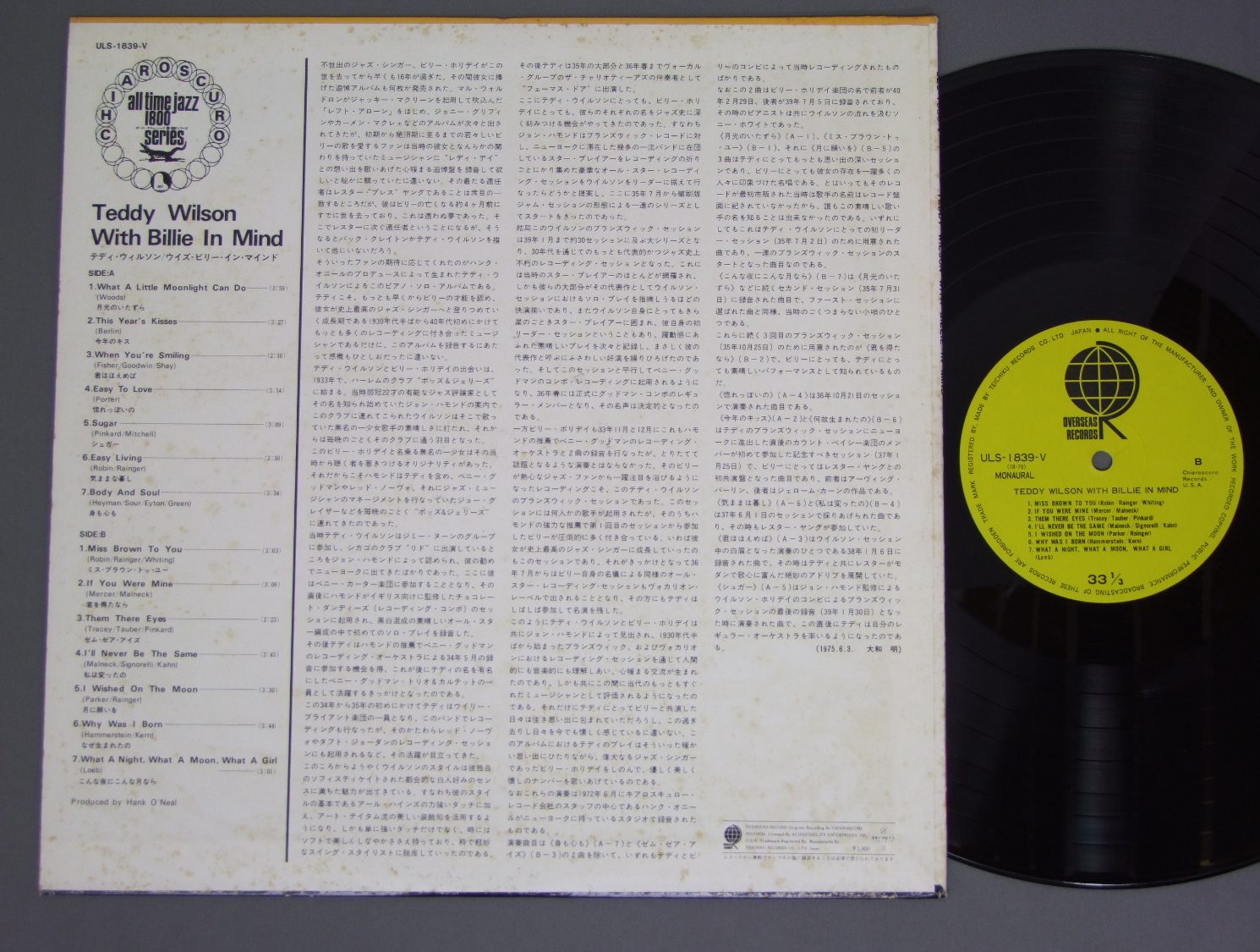 TEDDY WILSON/WITH BILLIE IN MIND ULS1839V 製造国:日本盤 / Media:LP外観:VG+盤の状態:EX 価格(税込):¥524(売約済) 送料 7inch:定形外郵便 360円~LP:定形外郵便 660円~送料は、注文の最終画面で確認頂けます。 > > TEDDY WILSON/WITH BILLIE IN MIND 外観 (VG+)特記事項:背に薄いシミ有り。ジャケ表面はシミやや多め。スレやスリキズ等は薄い感じ。外観VG+の共通説明:ダメージやや有り。シミ、ヨゴレ、スレなど多少~やや多め。 盤の状態 (EX)特記事項:薄いスリキズ・スレ軽くある感じ。一見してきれいな印象です。盤EXの共通説明:盤面のスリキズが薄いものが少し~軽度 音に出そうなものは無いように見える(軽微なソフトティック音は除く)。 その他: ※画像では確認できない、上下ヘリ、背表紙、取り出し口を中心に状態表記しております。画像で確認出来る表裏ジャケ、レーベルの状態表記は省いている場合がありますので、そちらの状態は画像でご確認をお願い致します。携帯の方は一度PC等で写真をご確認の上ご入札下さいますよう、お願い申し上げます。 Tweet それぞれの画像をクリックすると、大きい写真が見られます こちらの商品もお勧めです 1,320円 THE QUINTETパーカー - ガレスピー - パウエル - ローチ - ミンガス / JAZZ AT MASSEY HALLジャズ・アット・マッセイ・ホール 1,210円 FLETCHER HENDERSON & HIS ORCHESTRAフレッチャー・ヘンダーソン / FIRST IMPRESSIONS VOL1 (1924-1931)ファースト・インプレッションズ VOL1 (1924-1931) 770円 VARIOUS ARTISTSエドモンド・ホール他 / 52nd STREET SESSIONS52番街セッションズ 770円 HAL McKUSICKハル・マジック / JAZZ WORKSHOPジャズ・ワークショップ 990円 MODERN JAZZ QUARTETモダン・ジャズ・クワルテット / IN MEMORIAMイン・メモリアル 1,320円 CHARIE BYRD - HERB ELLIS - BARNY KESSELチャーリー・バード - ハーブ・エリス - バーニー・ケッセル / GREAT GUITEARS 2グレート・ギター 2 1,320円 SADAO WATANABE & CHARLIE MARIANO渡辺貞夫&チャーリー・マリアーノ / IBERIAN WALTZイベリアン・ワルツ 1,320円 BOB CROSBY`S BOB CATSボブ・クロスビーのボブ・キャッツ / BOB CROSBY`S BOB CATSボブ・クロスビーのボブ・キャッツ