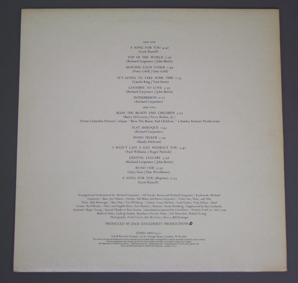 CARPENTERS/SONG FOR YOU AMLS63511 製造国:英国盤 / Media:LPMatrix:A-1△G | B-1△G外観:VG+盤の状態:EX 価格(税込):¥4,950(売約済) 送料 7inch:定形外郵便 360円~LP:定形外郵便 660円~送料は、注文の最終画面で確認頂けます。 レコード検索 > 1980s–90s > CARPENTERS/SONG FOR YOU 外観 (VG+)特記事項:背に薄い日焼有り。上下ヘリの背側によごれ。表ジャケにレコードリングスレやや有りますが、それを除けばジャケ表面は全体的にスレやスリキズ、よごれ等は薄い感じオリジナルインナーは両サイドと底にテープ跡。抜けは無いです。書込み有り。外観VG+の共通説明:ダメージやや有り。シミ、ヨゴレ、スレなど多少~やや多め。 盤の状態 (EX)特記事項:薄いスリキズ・スレ少しある程度。音に出そうなものもなく一見してきれいな状態です。曲間など、静かなところを中心に聴いて見ましたが、チリノイズ少ないきれいな再生具合でした。盤EXの共通説明:盤面のスリキズが薄いものが少し~軽度 音に出そうなものは無いように見える(軽微なソフトティック音は除く)。 その他:両面のレーベルにステッカー小有り。 初回の茶色レーベルは時期的に大変レア。彼等の英国盤アルバム初回ものの中では最もハードルの高い一枚。大変貴重なものです。 Tweet それぞれの画像をクリックすると、大きい写真が見られます こちらの商品もお勧めです 7,700円 SUSAN MAUGHAN / I WANNA BE BOBBY`S GIRL 3,850円 NICO / THE END 5,060円 JONI MITCHELL / CHALK MARK IN A RAIN STORM 4,950円 JONI MITCHELL / DOG EAT DOG 4,400円 JONI MITCHELL / DOG EAT DOG 4,950円 SANDY DENNY / RENDEZVOUS
