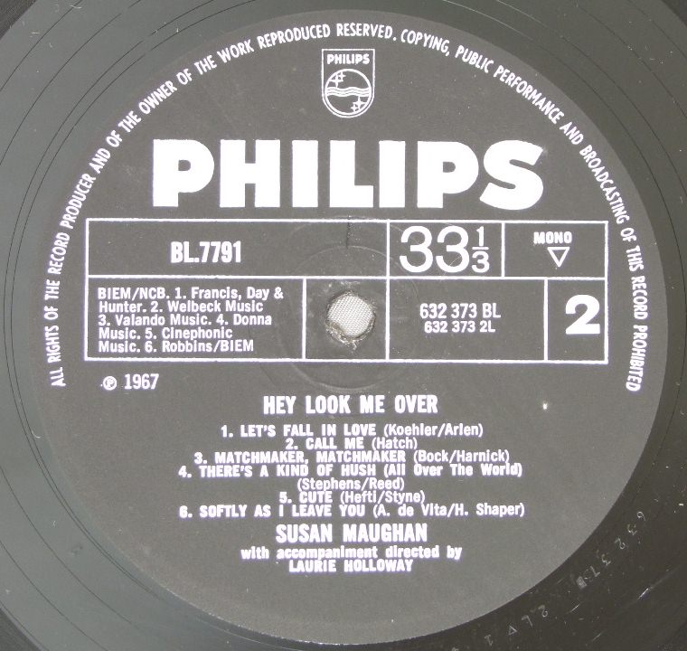 SUSAN MAUGHAN/HEY LOOK ME OVER BL7791 製造国:英国盤 / Media:LP外観:EX盤の状態:EX 価格(税込):¥8,250(売約済) 送料 7inch:定形外郵便 360円~LP:定形外郵便 660円~送料は、注文の最終画面で確認頂けます。 レコード検索 > CLASSIC CHAMBER > SUSAN MAUGHAN/HEY LOOK ME OVER 外観 (EX)特記事項:角スレ多少有り。表ジャケはレコード取り出し口付近にコーティングのヨレシワが多少ありますが、全体的にはヨレシワは多くは無い感じ。スレやスリキズも薄い感じです。裏ジャケもスレやよごれは少ない感じ。外観EXの共通説明:ダメージが限定的。中古品としては保存状態がよい方。シミ、ヨゴレ、スレ 少し~軽度。 盤の状態 (EX)特記事項:少し長めのうっすらスレキズが少し有るぐらい。盤も黒さがしっかり残っていて薄いスリキズ、スレも少し。一見してきれいな状態です。曲間など、静かなところを中心に聴いて見ましたが、チリノイズ少ないきれいな再生具合でした。盤EXの共通説明:盤面のスリキズが薄いものが少し~軽度 音に出そうなものは無いように見える(軽微なソフトティック音は除く)。 Tweet それぞれの画像をクリックすると、大きい写真が見られます こちらの商品もお勧めです 5,060円 JONI MITCHELL / CHALK MARK IN A RAIN STORM 4,950円 JONI MITCHELL / DOG EAT DOG 4,400円 JONI MITCHELL / DOG EAT DOG 4,950円 SANDY DENNY / RENDEZVOUS 3,850円 NICO / THE END 7,700円 SUSAN MAUGHAN / I WANNA BE BOBBY`S GIRL