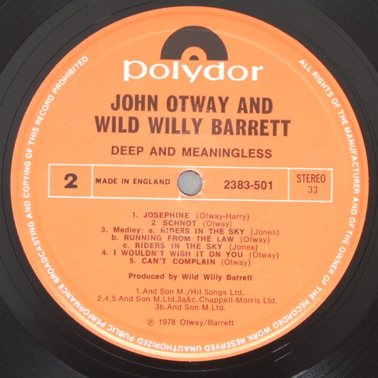 JOHN OTWAY AND WILD WILLY BARRNETT/DEEP AND MEANINGLESS 2383 501 製造国:英国盤 / Media:LPMatrix:A//1 | B//1外観:EX盤の状態:EX+ 価格(税込):¥1,320(売約済) 送料 7inch:定形外郵便 360円~LP:定形外郵便 660円~送料は、注文の最終画面で確認頂けます。 > > JOHN OTWAY AND WILD WILLY BARRNETT/DEEP AND MEANINGLESS 外観 (EX)特記事項:背付近にヨレシワが数本。表ジャケは弱めのスリキズやや多めですが、全体的にスレやよごれ等は少ないしっかりした印象有り。裏ジャケは薄いスリキズや細かいスリキズ多少有り。外観EXの共通説明:ダメージが限定的。中古品としては保存状態がよい方。シミ、ヨゴレ、スレ 少し~軽度。 盤の状態 (EX+)特記事項:極薄いスリキズ・スレ少しある程度。音に出そうなものもなく一見してきれいな状態です。曲間など、静かなところを中心に聴いて見ましたが、チリノイズ少ないきれいな再生具合でした。盤EX+の共通説明:盤面の極薄いスリキズ、スレ少し程度 音に出そうなものは無いように見える(極軽微なソフトティック音は除く)。 Tweet それぞれの画像をクリックすると、大きい写真が見られます こちらの商品もお勧めです 1,650円 JONATHAN EDWARDS / CAPRICORN 770円 GARY BENSON / MOONLIGHT WALKING 880円 GINO VANNELLI / BACK CARS 1,320円 JOHN DENVER / SPIRIT 1,650円 KEITH / ADVENTURES OF KEITH 1,540円 DAVID McCALLUM / MUSIC-A PART OF ME 1,320円 JOHN WILLIAMS / HEIGHT BELOW 1,100円 VANGELS / TO THE UNKNOWN MAN