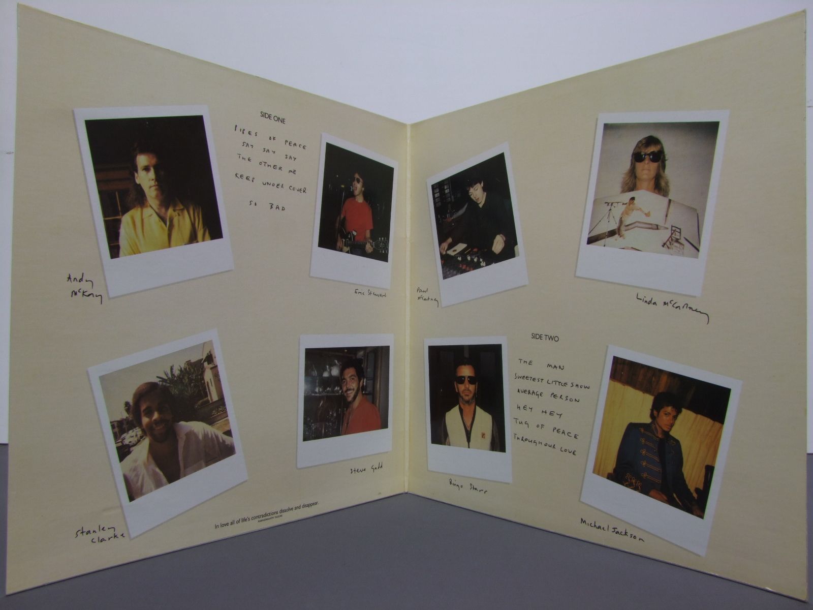 PAUL McCARTNEY/PIPES OF PEACE PCTC1652301 製造国:英国盤 / Media:LPMatrix:A-3U-1-1 | B-2U-1-1外観:EX+盤の状態:EX+ 価格(税込):¥4,400(売約済) 送料 7inch:定形外郵便 360円~LP:定形外郵便 660円~送料は、注文の最終画面で確認頂けます。 > > PAUL McCARTNEY/PIPES OF PEACE 外観 (EX+)特記事項:ジャケ表面は全体的にスレやスリキズ、よごれ等は薄い感じ。インナーもあまりヨレやよごれ等は無い感じ。抜けも無いです。外観EX+の共通説明:中古としては美品、一見してきれいでダメージが軽微。シミ、ヨゴレ、スレ有っても僅か~少し。 盤の状態 (EX+)特記事項:極薄いスリキズ・スレ少しだけ。一見してきれいな状態です。曲間など、静かなところを中心に聴いてみましたが、チリノイズ少ないきれいな再生具合でした。盤EX+の共通説明:盤面の極薄いスリキズ、スレ少し程度 音に出そうなものは無いように見える(極軽微なソフトティック音は除く)。 Tweet それぞれの画像をクリックすると、大きい写真が見られます こちらの商品もお勧めです 5,500円 GEORGE HARRISON / LIVING IN THE MATERIAL WORLD 5,500円 GEORGE HARRISON / THIRTY THREE & 1/3 5,500円 JOHN LENNON / SHAVED FISH 4,950円 JOHN & YOKO - PLASTIC ONO BANDF / SOME TIME IN NEW YORK CITY 5,500円 BEATLES / AT THE HOLLYWOOD BOWL