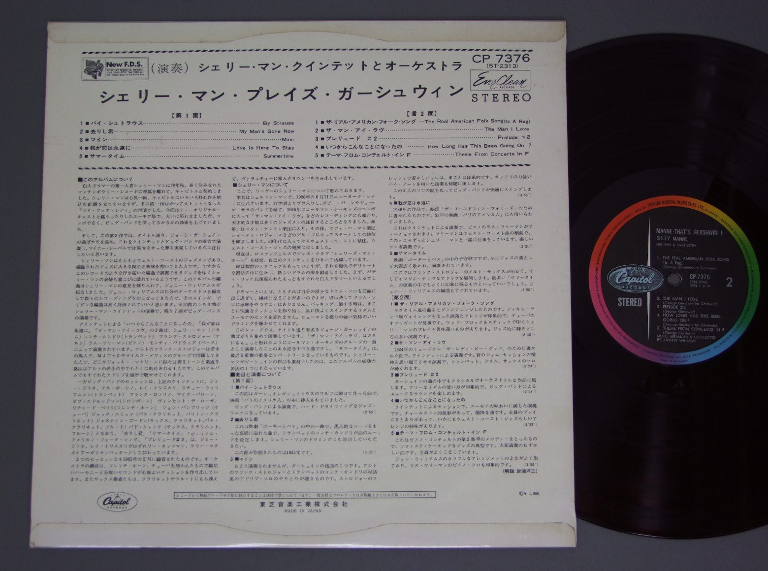 SHELLY MANNE AND BIG BAND/MANNE-THAT`S GERSHWINペラジャケ 赤盤 CP7376 製造国:日本盤 / Media:LP外観:EX盤の状態:EX+ 価格(税込):¥660(売約済) 送料 7inch:定形外郵便 360円~LP:定形外郵便 660円~送料は、注文の最終画面で確認頂けます。 > > SHELLY MANNE AND BIG BAND/MANNE-THAT`S GERSHWIN 外観 (EX)特記事項:ジャケ表面は全体的にスレやスリキズ、よごれ等は薄い感じ。外観EXの共通説明:ダメージが限定的。中古品としては保存状態がよい方。シミ、ヨゴレ、スレ 少し~軽度。 盤の状態 (EX+)特記事項:極薄いスリキズ・スレ少し。一見してきれいな状態です。盤EX+の共通説明:盤面の極薄いスリキズ、スレ少し程度 音に出そうなものは無いように見える(極軽微なソフトティック音は除く)。 Tweet それぞれの画像をクリックすると、大きい写真が見られます こちらの商品もお勧めです 770円 TEDDY WILSONテディ・ウイルソン / NOBLE ART OF TEDDY WILSONノーブル・アート・オブ・テディ・ウイルソン 1,320円 BOB CROSBY`S BOB CATSボブ・クロスビーのボブ・キャッツ / BOB CROSBY`S BOB CATSボブ・クロスビーのボブ・キャッツ 1,210円 EDDIE CONDON & OTHERSエディ・コンドン・アンド・アザーズ / CHICAGO&ALL THAT JAZZ!シカゴ・アンド・オール・ザット・ジャズ! 1,210円 BENNY GOODMAN TRIOベニーグッドマントリオ / PLAYS FOR FLETCHER HENDERSON FUNDプレイズ・フォー・ザ・フィレッチャー・ヘンダーソン 1,320円 GATO BARBIERIガトー・バルビエリ / TROPICOトロピコ 770円 THAD JONES & MEL LEWISサド・ジョーンズ & メル・ルイス / LIVE IN TOKYOライブ・イン・東京 1,320円 CHARLIE MINGUSチャーリー・ミンガス / PITHECANTHROPUS ERECTUS直立猿人 1,320円 McCOY TYNERマッコイ・タイナー / ECHOES OF A FRIENDエコーズ・オブ・ア・フレンド
