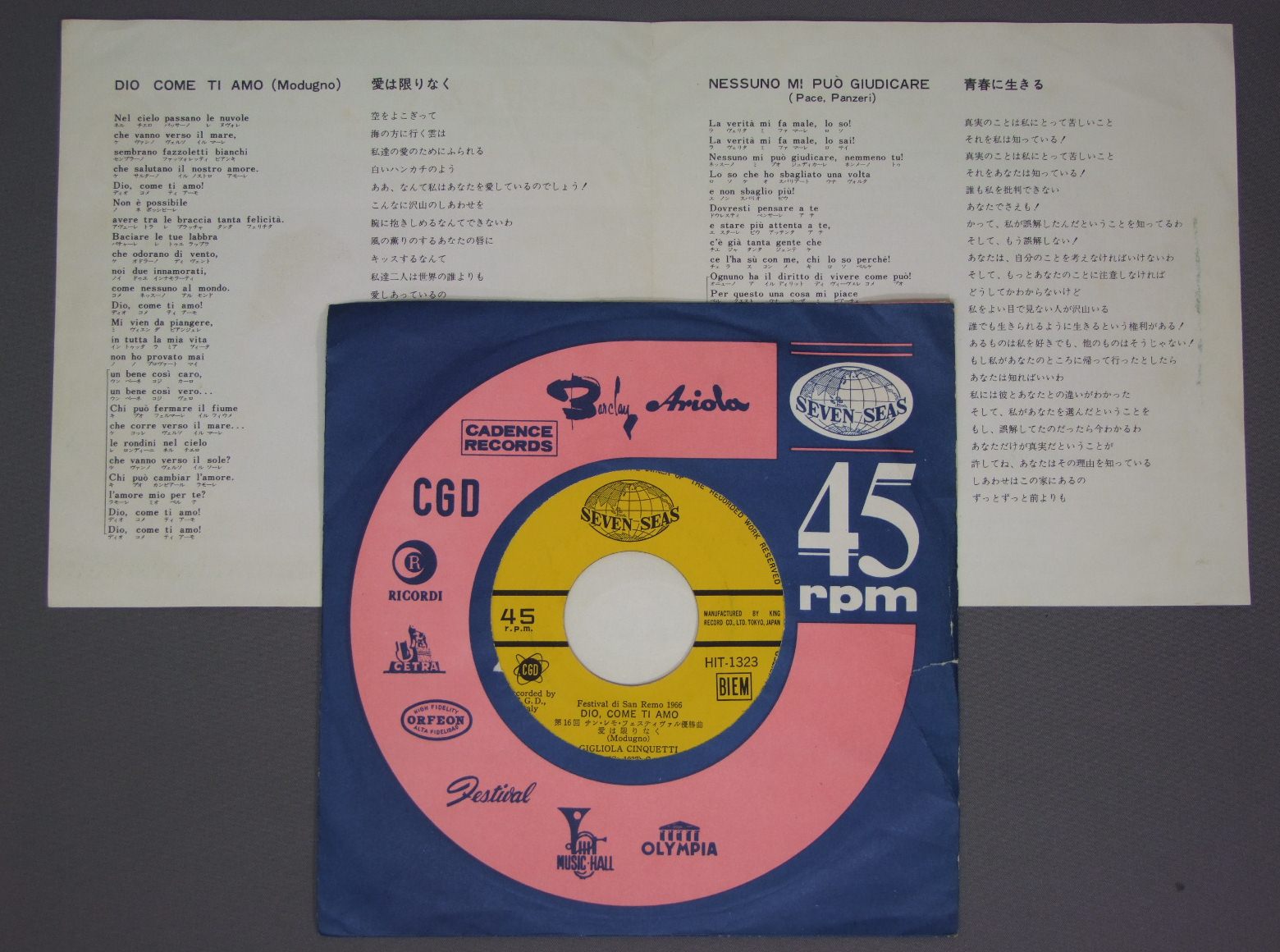 GIGLIOLA CINQUETTIジリオラ・チンクエッティ/DIO OME TI AM愛は限りなく 16回サンレモ優勝曲 HIT1323 製造国:日本盤 / Media:7inch外観:EX-盤の状態:VG+ 価格(税込):¥770(売約済) 送料 7inch:定形外郵便 360円~LP:定形外郵便 660円~送料は、注文の最終画面で確認頂けます。 > > GIGLIOLA CINQUETTI/DIO OME TI AM 外観 (EX-)特記事項:ヨレやや有り。よごれ等は薄い感じ。外観EX-の共通説明:ダメージ軽度~多少。 中古品としては普通の状態。シミ、ヨゴレ、スレなど軽く~多少。 盤の状態 (VG+)特記事項:薄いスリキズ・細かい表面スレ多少ある感じ。殆どが軽微なものの様子です。盤VG+の共通説明:盤面にスリキズが多少~やや有り、音に出そうなものも多少ある。 Tweet それぞれの画像をクリックすると、大きい写真が見られます こちらの商品もお勧めです 770円 RITA COOLIDGEリタ・クーリッジ / SOUNDS CAPSULE 1,980円 ELEN FOLEYエレン・フォーリー / SPIRIT OF ST LOUIS悲しみのシアター 770円 LACY J DALTONレイシー・ダルトン / TENNESSEE WALTZテネシー・ワルツ 1,320円 RITA COOLIDGEリタ・クーリッジ / INSIDE THE FIREインサイド・ザ・ファイアー 1,210円 OLIVIA NEWTON-JOHNオリビア・ニュートンジョン / LET ME BE THEREレット・ミー・ビー・ゼア 1,320円 MADONNAマドンナ / LIKE A VIRGINライク・ア・ヴァージン 660円 MARLENE DIETRICHマレーネ・ディートリッヒ / MAGIC OF MARLENE永遠の名花 880円 DAMIAダミア / CHANSON DE PARIS VOL5 `DAMIA`シャンソン・ド・パリ 第5集 ダミア