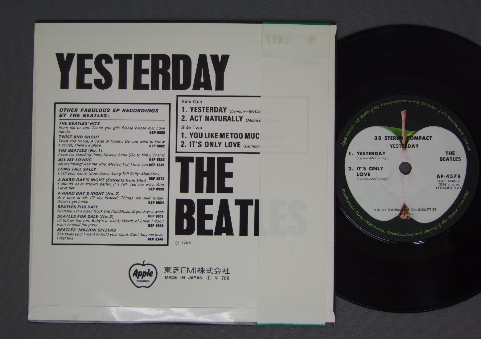 BEATLES/YESTERDAY EP AP4578 製造国:日本盤 / Media:7inch外観:EX盤の状態:EX+帯:EX 価格(税込):¥1,760(売約済) 送料 7inch:定形外郵便 360円~LP:定形外郵便 660円~送料は、注文の最終画面で確認頂けます。 > > BEATLES/YESTERDAY EP 外観 (EX)特記事項:ジャケ表面は全体的にスレやスリキズ、よごれ等は薄い感じ。外観EXの共通説明:ダメージが限定的。中古品としては保存状態がよい方。シミ、ヨゴレ、スレ 少し~軽度。 盤の状態 (EX+)特記事項:極薄いスリキズ・スレ少しだけ。一見してきれいな状態です。盤EX+の共通説明:盤面の極薄いスリキズ、スレ少し程度 音に出そうなものは無いように見える(極軽微なソフトティック音は除く)。 帯の状態 (EX):あまりヨレやよごれ等は無い感じ。 Tweet それぞれの画像をクリックすると、大きい写真が見られます こちらの商品もお勧めです 1,650円 PAUL McCARTNEYポール・マッカートニー / PIPES OF PEACEパイプス・オブ・ピース 1,320円 JOHN LENNON & YOKO ONOジョン・レノン.ヨーコ・オノ / MILK AND HONEYミルク・アンド・ハニー 1,210円 WINGSウィングス / VENUS & MARSヴィーナス・アンド・マース 1,540円 WINGSポール・マッカートニーとウイングス / LONDON TOWN 1,320円 WINGSウイングス / WINGS OVER AMERICAウイングス U.S.A.ライヴ!! 1,210円 WINGSウィングス / WINGS OVER AMERICAウィングスU.S.A ライヴ 880円 PAUL McCARTNEYポール・マッカートニー / TUG OF WARタグ・オブ・ウォー 770円 PAUL MCCARTNEY & WINGSポール・マッカートニー & ウイングス / WINGS AT THE SPEED OF SOUNDスピード・オヴ・サウンド