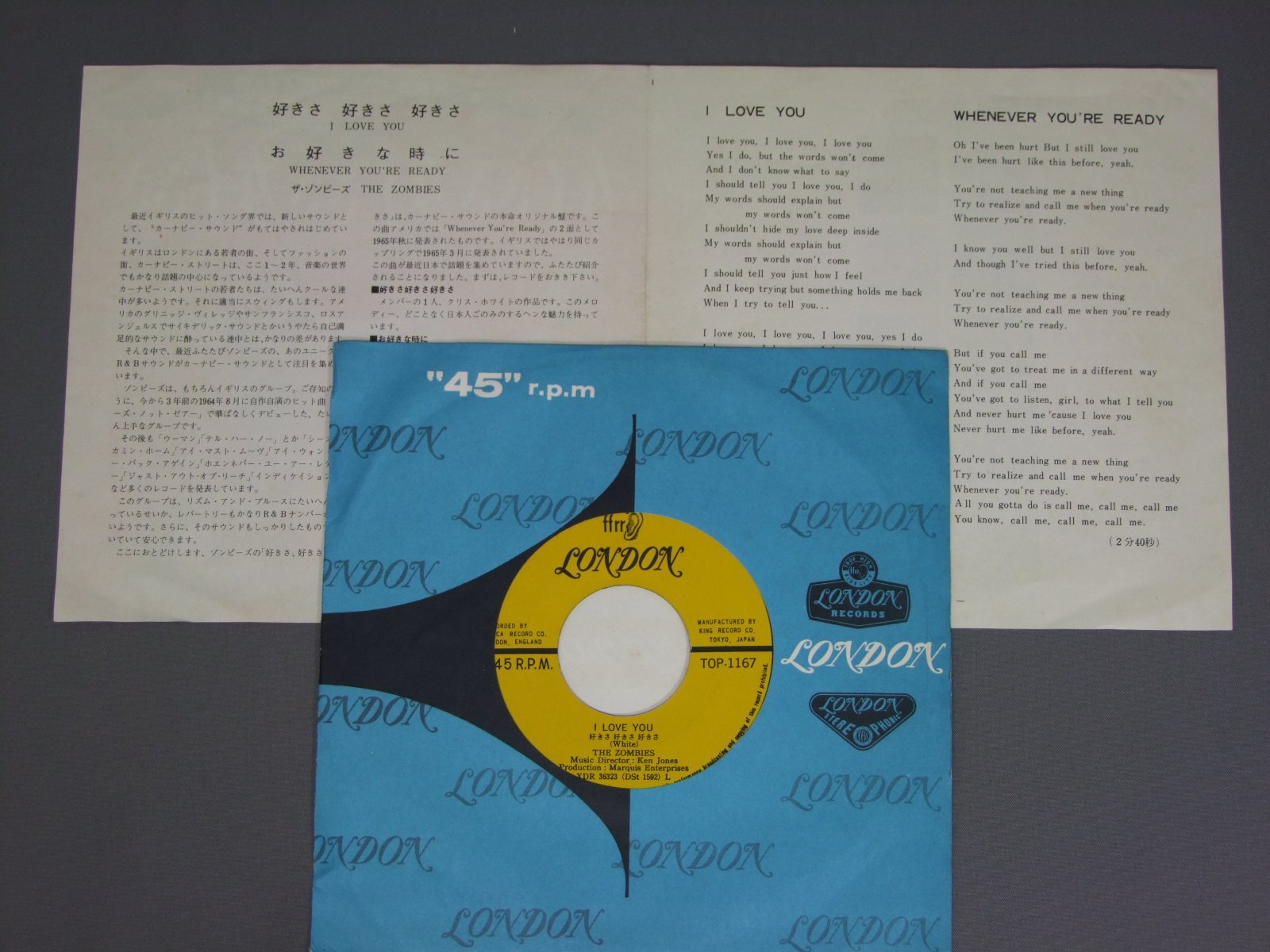 ZOMBIESゾンビーズ/I LOVE YOU好きさ 好きさ 好きさ TOP1167 製造国:日本盤 / Media:7inch外観:EX-盤の状態:EX 価格(税込):¥2,640(売約済) 送料 7inch:定形外郵便 360円~LP:定形外郵便 660円~送料は、注文の最終画面で確認頂けます。 > > ZOMBIES/I LOVE YOU 外観 (EX-)特記事項:ヨレ多少有り。見開きと裏側は経年風の薄いよごれ軽。外観EX-の共通説明:ダメージ軽度~多少。 中古品としては普通の状態。シミ、ヨゴレ、スレなど軽く~多少。 盤の状態 (EX)特記事項:触感のあまり無い感じのものですが細かい感じのスリキズ多少有り。盤EXの共通説明:盤面のスリキズが薄いものが少し~軽度 音に出そうなものは無いように見える(軽微なソフトティック音は除く)。 Tweet それぞれの画像をクリックすると、大きい写真が見られます こちらの商品もお勧めです 2,640円 SPOTNICKSスプートニクス / KARELIA-THE BEST OF THE SPOTNICKS霧のカレリア-ベスト・オブ・ザ・スプートニクス 4,950円 ANIMALSアニマルズ / BEST ALBUM アニマルズのすべて 赤盤
