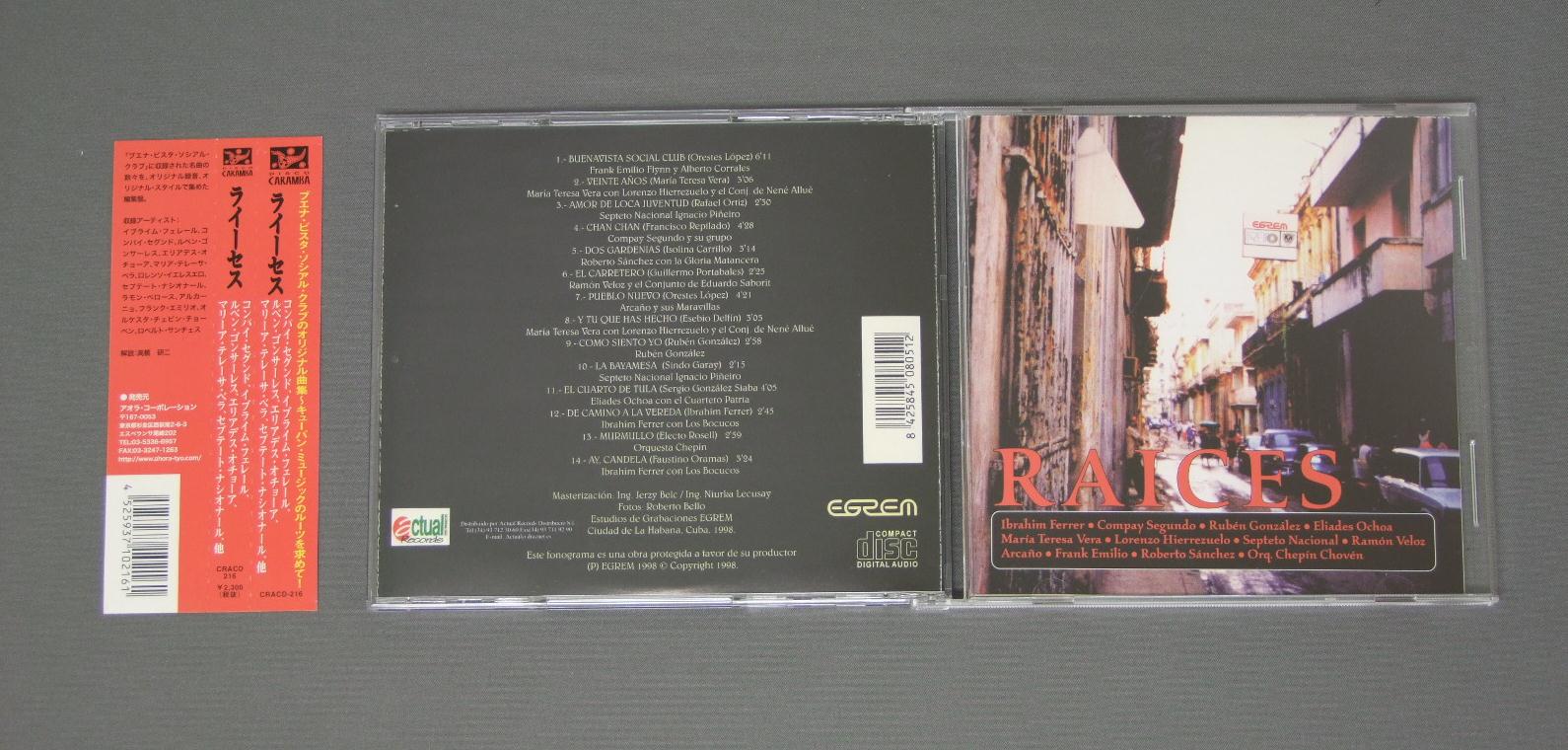 Raices/Raicesキューバン・ミュージックのルーツ CRACD216 製造国:輸入盤 / Media:CD外観:EX盤の状態:EX+帯:EX 価格(税込):¥770 送料 7inch:定形外郵便 360円~LP:定形外郵便 660円~送料は、注文の最終画面で確認頂けます。 レコード検索 > SWING/BIG BAND > Raices/Raices 外観 (EX)特記事項:ブックレット・タイプの英語解説付ジャケ。日本語解説カード付。表ジャケは、見開き側縁にドット風のキズが有り。ジャケ両面共に、軽いよごれ有り。全体的にスレやめくりヨレなど無くしっかりした状態。ケースの裏側のジャケの内側に軽シミ有り。カードは内側の折り目に経年風の薄い軽シミ有り。外観EXの共通説明:ダメージが限定的。中古品としては保存状態がよい方。シミ、ヨゴレ、スレ 少し~軽度。 盤の状態 (EX+)特記事項:微細なスリキズが少々。きれいな感じの盤面です。盤EX+の共通説明:盤面の極薄いスリキズ、スレ少し程度 音に出そうなものは無いように見える(極軽微なソフトティック音は除く)。 帯の状態 (EX):ヨレが少々有りますが、よごれも少ないしっかりした状態。裏側に薄い感じの軽シミ少し有り。 Tweet それぞれの画像をクリックすると、大きい写真が見られます こちらの商品もお勧めです