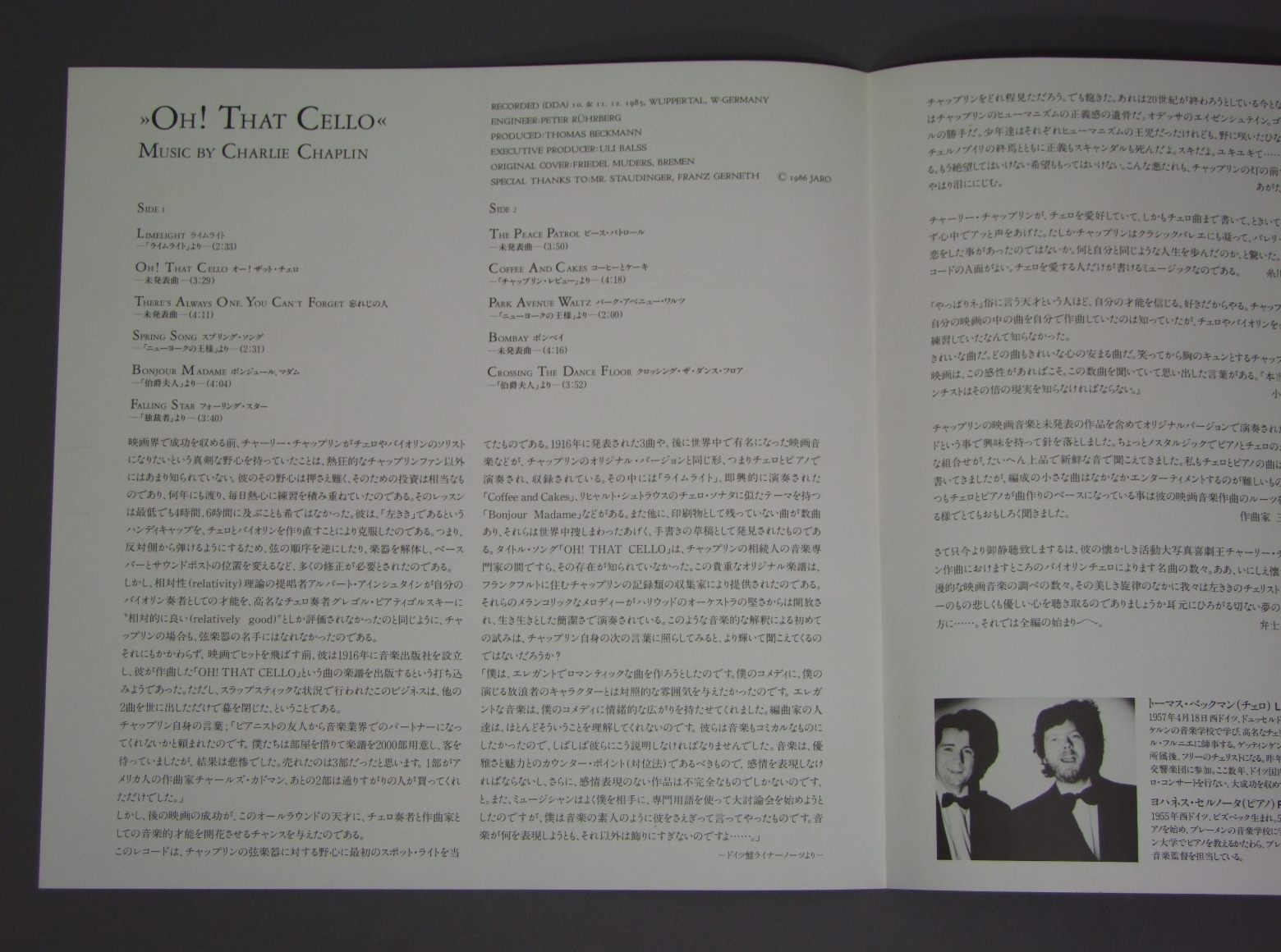 CHARLIE CHAPLINチャーリー・チャップリン/OH THAT CELLOオリジナル作曲集 28MU0007 製造国:日本盤 / Media:LP外観:EX+盤の状態:EX+帯:EX+ 価格(税込):¥1,100(売約済) 送料 7inch:定形外郵便 360円~LP:定形外郵便 660円~送料は、注文の最終画面で確認頂けます。 > > CHARLIE CHAPLIN/OH THAT CELLO 外観 (EX+)特記事項:ジャケ表面はあまりスレやスリキズ、よごれ等は少ない感じ。外観EX+の共通説明:中古としては美品、一見してきれいでダメージが軽微。シミ、ヨゴレ、スレ有っても僅か~少し。 盤の状態 (EX+)特記事項:極薄いスリキズ・スレ少し。一見してきれいな状態です。盤EX+の共通説明:盤面の極薄いスリキズ、スレ少し程度 音に出そうなものは無いように見える(極軽微なソフトティック音は除く)。 帯の状態 (EX+):あまりヨレやよごれ等は無い感じ。 その他:見本盤 Tweet それぞれの画像をクリックすると、大きい写真が見られます こちらの商品もお勧めです 880円 TV SOUND TRACK2大刑事ドラマ / ORETACHINO KUNSHO俺たちの勲章-太陽にほえろ ! テレビ主題曲集 1,320円 無声映画鑑賞会 / おお活動大写真 1,650円 FRANCIS COPPOLAフランシス・コッポラ / SOUNDTRACK APOCALYPSE NOWサントラ 地獄の黙示録 770円 VANGELISヴァンゲリス / CHARIOTS OF FIREチャリオッツ・オブ・ファイアー 880円 JOHN ADDISONジョン・アディスン / SOUNDTRACK BRIDGE TOO FAR映画 遠すぎた橋 880円 平尾昌晃 水谷豊 / ドラマ 熱中時代-主演・水谷豊 660円 RALPH BURNSラルフ・バーンズ / SOUND TRACK ALL THAT JAZZ映画オール・ザット・ジャズ 1,980円 HIROSHI AKUTAGAWA - TOKYO SYMPHONY ORCHESTRA芥川比呂志 - 東京交響楽団 / SOUNDTRACK SUNA-NO UTSUWA松竹映画 砂の器