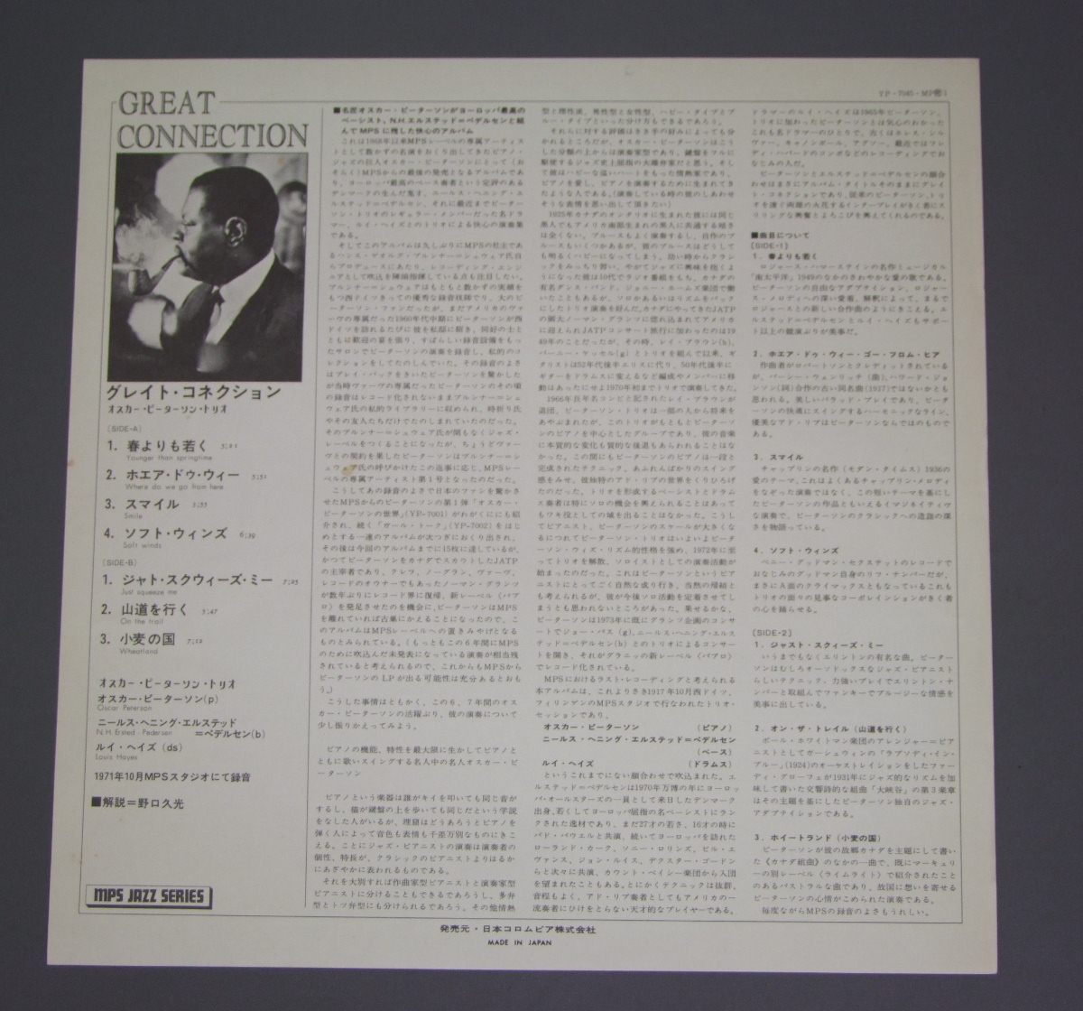 OSCAR PETERSON TRIO/GREAT CONNECTION YP7045MP 製造国:日本盤 / Media:LP外観:VG+盤の状態:EX+ 価格(税込):¥524(売約済) 送料 7inch:定形外郵便 360円~LP:定形外郵便 660円~送料は、注文の最終画面で確認頂けます。 > > OSCAR PETERSON TRIO/GREAT CONNECTION 外観 (VG+)特記事項:上ヘリにスレやや有り。底スレも多少。表ジャケ表面は全体的にスレやスリキズ、よごれ等は薄い感じ。裏ジャケに薄いシミやや有り。外観VG+の共通説明:ダメージやや有り。シミ、ヨゴレ、スレなど多少~やや多め。 盤の状態 (EX+)特記事項:極薄いスリキズ・スレ少しだけ。一見してきれいな状態です。盤EX+の共通説明:盤面の極薄いスリキズ、スレ少し程度 音に出そうなものは無いように見える(極軽微なソフトティック音は除く)。 Tweet それぞれの画像をクリックすると、大きい写真が見られます こちらの商品もお勧めです 660円 JACQUES LOUSSIERジャック・ルーシエ・トリオ / PLAY BACH VOL.4プレイ・バッハ 第4集 990円 JAMES NEWTONジェームズ・ニュートン / DAYDREAMデイドリーム 770円 MODERN JAZZ QUARTETMJQ / LAST CONCERTラスト・コンサート 770円 BENNY GOODMANベニー・グッドマン他 / MR BENNY GOODMAN (BENNY GOODMAN STORY)映画ベニー・グッドマン物語 1,210円 BUCK CLAYTONバック・クレイトン・オールスターズ / HUCKLE-BUCK AND ROBBINS` NEST A BUCK CLAYTON JAM SESSIONバック・クレイトン・ジャム・セッション 1,210円 SONY CLARK TRIOソニー・クラーク・トリオ / SAME TITLEソニー・クラーク・トリオ 660円 LALO SCHIFRINラロ・シフリン / BLACK WIDOWブラック・ウィンドウ 770円 STANLEY CLARKE / JOURNEY TO LOVE