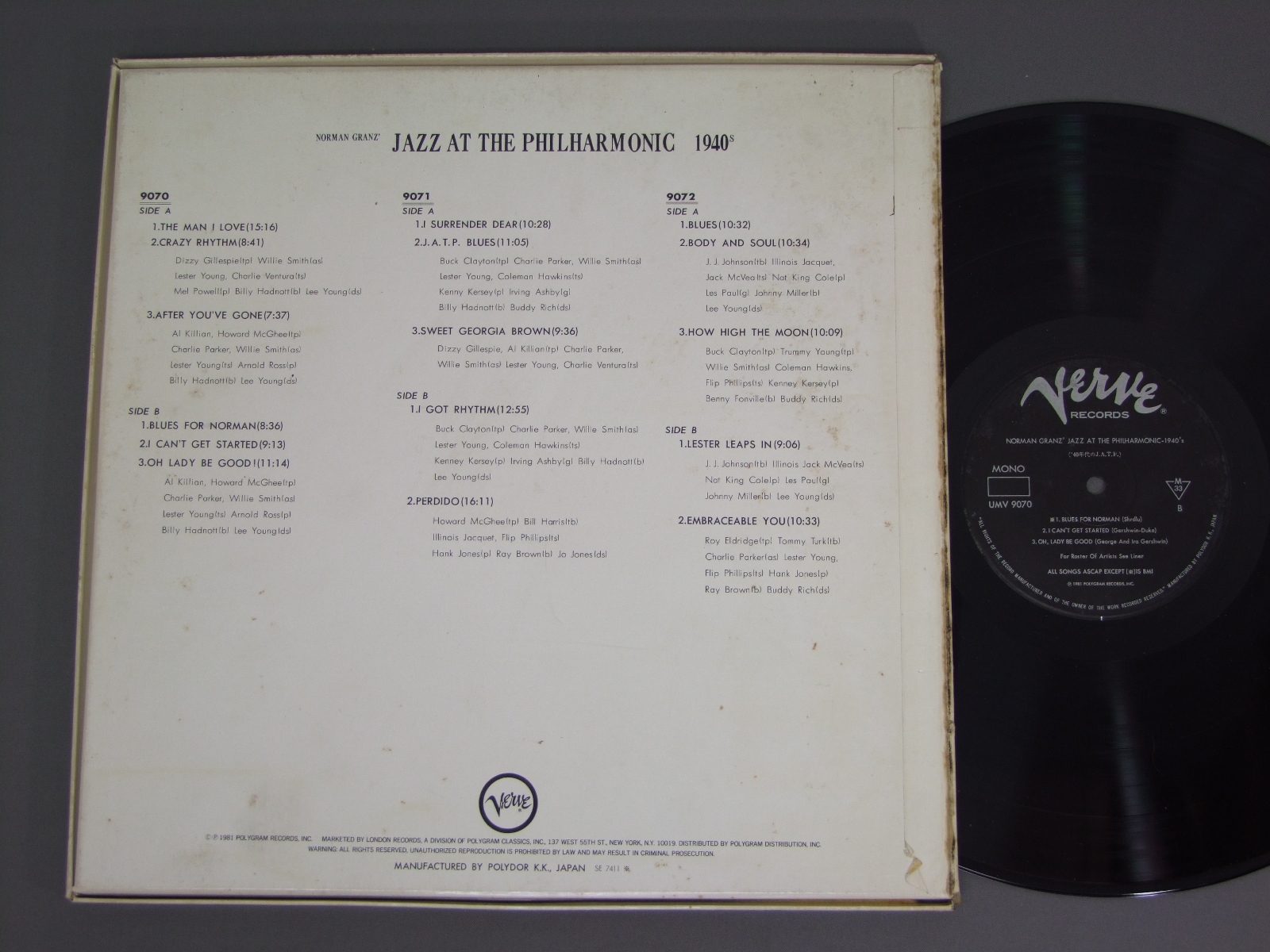 NORMAN GRANZ`/JAZZ AT THE PHILHARMONIC 1940`S UMV9070/2 製造国:日本盤 / Media:LP外観:VG+盤の状態:EX 価格(税込):¥2,619(売約済) 送料 7inch:定形外郵便 360円~LP:定形外郵便 660円~送料は、注文の最終画面で確認頂けます。 > > NORMAN GRANZ`/JAZZ AT THE PHILHARMONIC 1940`S 外観 (VG+)特記事項:表箱の上の両角に割れ。上へリはよごれやスレ多いです。背にスレやよごれ軽多少有り。他のヘリもスレやよごれは多少有り。箱表はスレやスリキズは薄い感じですが、薄いスレよごれやシミやや有り。底箱は背側縁でスレやよごれ。全体的にはスレやスリキズ、よごれ等は薄めのものが中心。シミ多少有り。ブックレットの付属は無く、その代わりコピーが付属。外観VG+の共通説明:ダメージやや有り。シミ、ヨゴレ、スレなど多少~やや多め。 盤の状態 (EX)特記事項:3枚とも薄いスリキズ・スレ少し。一見してきれいな状態です。盤EXの共通説明:盤面のスリキズが薄いものが少し~軽度 音に出そうなものは無いように見える(軽微なソフトティック音は除く)。 その他:一枚目のレーベルにシミ。 Tweet それぞれの画像をクリックすると、大きい写真が見られます こちらの商品もお勧めです 880円 NEWPORT ALL STARSニューポート・オールスターズ / TRIBUTE TO DUKE ( LIVE IN BASEL SWISS 1969 OCT )デューク・エリントンに捧ぐ 770円 ERROLL GARNER-ARCHIE SHEPP etc / SAVOY 100 ALUMS-SPECIAL MENUサヴォイ・スペシャル・メニュー 660円 LALO SCHIFRINラロ・シフリン / BLACK WIDOWブラック・ウィンドウ 1,650円 HIDEIKO MATSUMOTO松本英彦 / PREDICTION風紀行 1,320円 GERY PEACOCKゲーリー・ピーコック / TALES OF ANOTHERTALES OF ANOTHER 770円 STANLEY CLARKE / JOURNEY TO LOVE 1,210円 JIMMY SMITHジミー・スミス / PORTUGUESE SOULポルトガル・ソウル 660円 EDDIE CONDONエディ・コンドン / CONDON A LA CARTEコンドン・ア・ラ・カルト