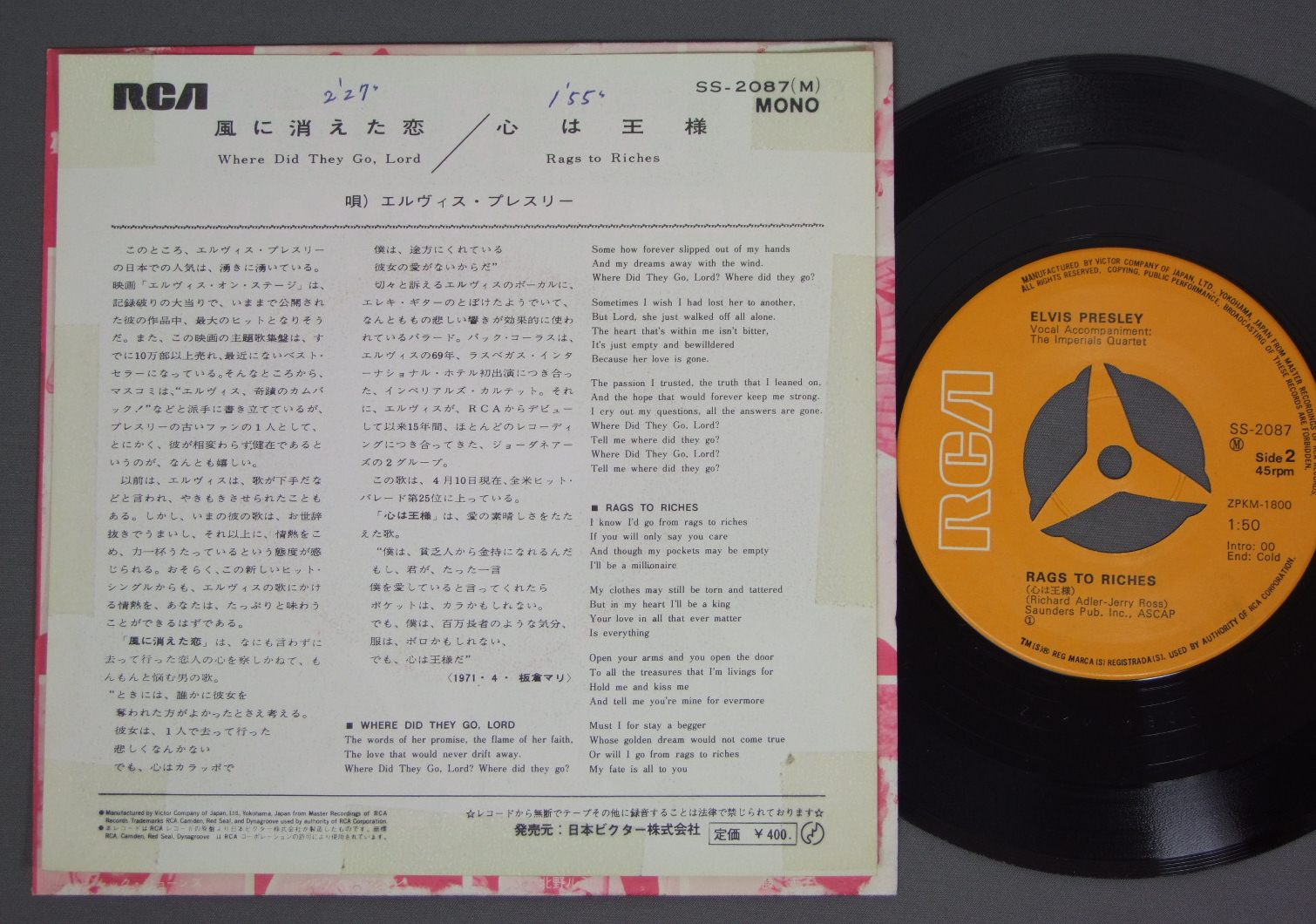 ELVIS PRESLEYエルビス・プレスリー/WHERE DID THEY GO LORD風に消えた恋 SS2087 製造国:日本盤 / Media:7inch外観:EX-盤の状態:EX 価格(税込):¥1,100(売約済) 送料 7inch:定形外郵便 360円~LP:定形外郵便 660円~送料は、注文の最終画面で確認頂けます。 > > ELVIS PRESLEY/WHERE DID THEY GO LORD 外観 (EX-)特記事項:裏ジャケにテープ。外観EX-の共通説明:ダメージ軽度~多少。 中古品としては普通の状態。シミ、ヨゴレ、スレなど軽く~多少。 盤の状態 (EX)特記事項:特記無し。コンディションリストを参照下さい。盤EXの共通説明:盤面のスリキズが薄いものが少し~軽度 音に出そうなものは無いように見える(軽微なソフトティック音は除く)。 Tweet それぞれの画像をクリックすると、大きい写真が見られます こちらの商品もお勧めです 770円 ELVIS PRESLEYエルヴィス・プレスリー / ELVIS-THAT`S THE WAY IT ISこの胸のときめきを -MGM映画 エルヴィス・オン・ステージ 主題歌集 1,650円 ELVIS PLESLEYエルヴィス.プレスリー / ELVIS-THAT`S THE WAY IT ISエルヴィス.オン・ステージVOL.1 1,210円 EVERLY BROTHERSエヴァリー・ブラザース / DATE WITH EVERY BROTHERSデイト・ウィズ・エヴァリー・ブラザーズ 990円 VENTURESベンチャーズ / ROOK`N`ROLL GRAFFITIロックン・ロール・グラフィティ 660円 PAUL ANKAポール・アンカ / BEST OF PAUL ANKAポール・アンカのすべて 1,210円 ELVIS PRESLEY / ELVIS AS RECORDED AT MADISON SQUARE GARDENエルヴィス・イン・ニューヨーク 880円 LETTERMENレターメン / LOVE BOOK愛の世界 990円 ELVISエルヴィス / THIS IS ELVIS-SELECTIONS FROM THE ORIGINAL MOTION PICUTRE SOUNDTRACK映画 THIS IS ELVIS オリジナル・サウンドトラック