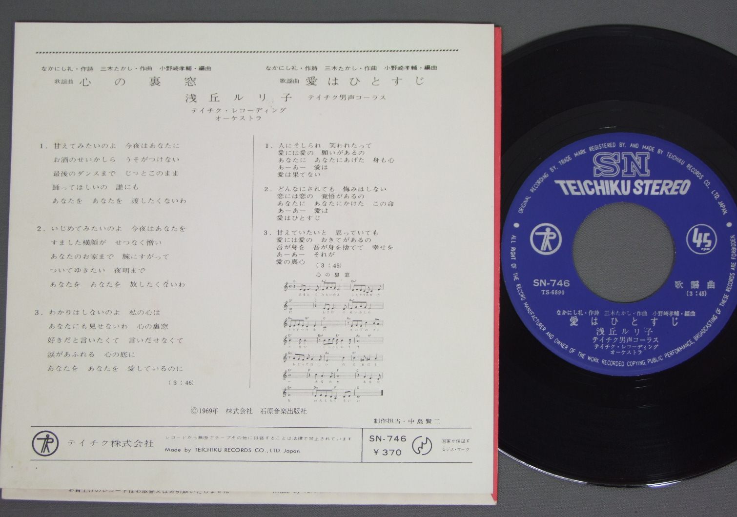 浅丘ルリ子/心の裏窓 SN746 製造国:日本盤 / Media:7inch外観:EX盤の状態:EX 価格(税込):¥838(売約済) 送料 7inch:定形外郵便 360円~LP:定形外郵便 660円~送料は、注文の最終画面で確認頂けます。 > > / 外観 (EX)特記事項:あまりヨレやよごれ等は無い感じ。右下にホッチキス穴。外観EXの共通説明:ダメージが限定的。中古品としては保存状態がよい方。シミ、ヨゴレ、スレ 少し~軽度。 盤の状態 (EX)特記事項:薄いスリキズ・スレ軽くある感じ。軽微なものの様子です。盤EXの共通説明:盤面のスリキズが薄いものが少し~軽度 音に出そうなものは無いように見える(軽微なソフトティック音は除く)。 その他:※画像では確認できない、上下ヘリ、背表紙、取り出し口を中心に状態表記しております。画像で確認出来る表裏ジャケ、レーベルの状態表記は省いている場合がありますので、そちらの状態は画像でご確認をお願い致します。携帯の方は一度PC等で写真をご確認の上ご入札下さいますよう、お願い申し上げます。 Tweet それぞれの画像をクリックすると、大きい写真が見られます こちらの商品もお勧めです 1,320円 NOA HORIGUCHI堀口ノア / NOA 660円 LILYりりィ / TAEKOタエコ 770円 RYOKO MORIYAMA森山良子 / RYOKO MORIYAMA COLLEGE FOLK ALBUM森山良子カレッジ・フォーク・アルバム 1,320円 OKAWARI SISTERSおかわりシスターズ / L.A.S.Tラ・ス・ト カレンダー付 3,850円 EIICHI OHTAKI大滝詠一 / EACH TIME MASTER SOUND PRESSINGEACH TIME MASTER SOUND盤 770円 KENJI SAWADA沢田研二 / OMOIKKIRI KIZANA JINSEI思いきり気障な人生 990円 YUKO TOMITAとみたゆう子 / COLOURSカラーズ (1st ALBUM) 770円 YUMING松任谷由実 / RINCARNATIONリ・インカーネイション