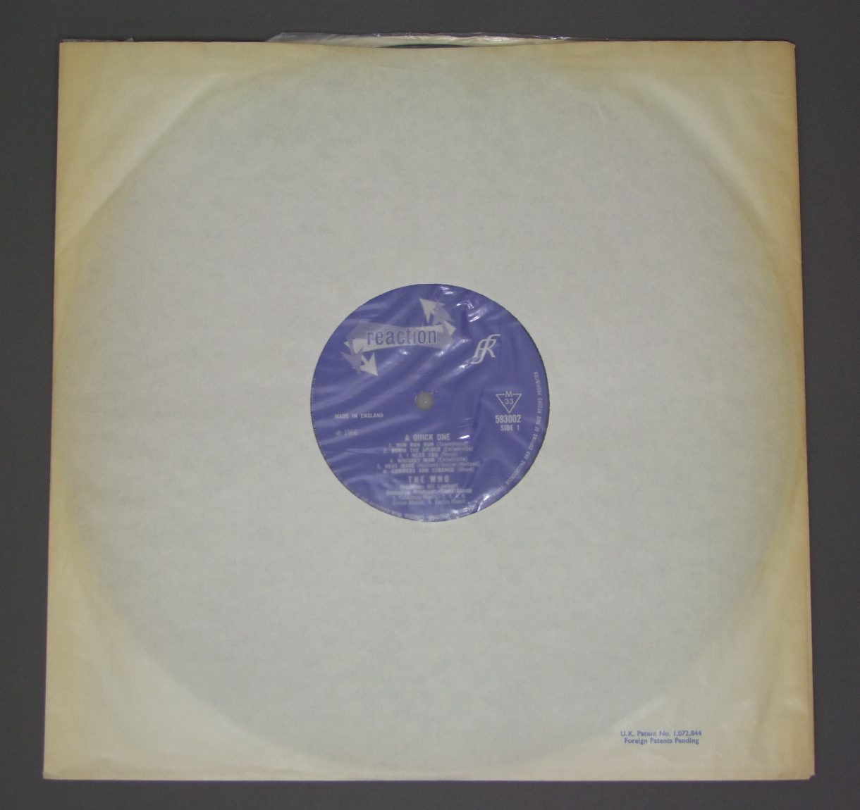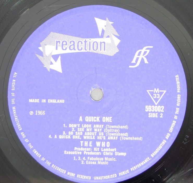 WHO/QUICK ONE 593 002 製造国:英国盤 / Media:LPMatrix:A//2 | B//2外観:EX-盤の状態:EX- 価格(税込):¥13,200(売約済) 送料 7inch:定形外郵便 360円~LP:定形外郵便 660円~送料は、注文の最終画面で確認頂けます。 > > WHO/QUICK ONE 外観 (EX-)特記事項:ジャケ表面は表裏ジャケ共に背や上ヘリ付近に短いコーティングのシワが多少ありますが、ヨレシワは全体的に少なめと思います。スレやスリキズ等も薄いものが中心。裏ジャケの背に沿ってコーティングの浮き多少有り。レコード取り出し口上ヘリにスレが少し。小さな感じですが上ヘリ付近左右にホッチキス穴有り。外観EX-の共通説明:ダメージ軽度~多少。 中古品としては普通の状態。シミ、ヨゴレ、スレなど軽く~多少。 盤の状態 (EX-)特記事項:薄いスリキズ・細かい表面スレ多少ある感じ。触感のある小キズは何箇所か有りますが、モノ針ならほとんど音に出てなく、気になるような周期的プチは感じませんでした。いないようでした。曲間等を中心にモノ針で聴いてみましたが、チリプチ少ない綺麗な再生具合です。盤EX-の共通説明:盤面のスリキズが多少有り。音に出そうなものは殆ど無いように見える~さほど気にならないぐらいの軽いプチ数カ所程度。 Tweet それぞれの画像をクリックすると、大きい写真が見られます こちらの商品もお勧めです 5,500円 WHO / MY GENERATION ( VIRGIN )