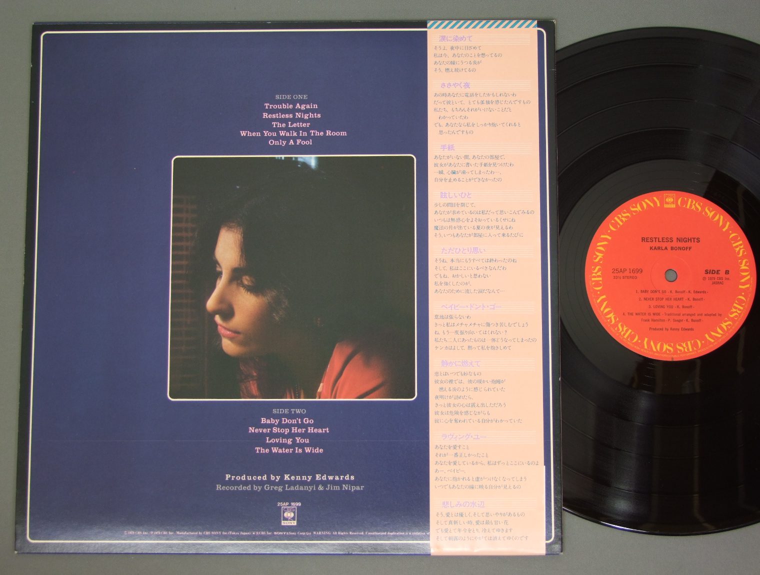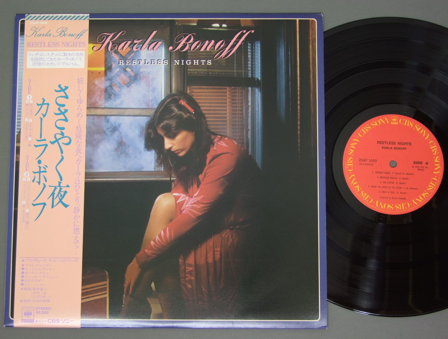 KARLA BONOFFカーラ・ボノフ/RESTLESS NIGHTSささやく夜 25AP1699 製造国:日本盤 / Media:LP外観:EX盤の状態:EX- 価格(税込):¥315(売約済) 送料 7inch:定形外郵便 360円~LP:定形外郵便 660円~送料は、注文の最終画面で確認頂けます。 > > KARLA BONOFF/RESTLESS NIGHTS 外観 (EX)特記事項:ジャケ表面は全体的にスレやスリキズ、よごれ等は薄い感じ。外観EXの共通説明:ダメージが限定的。中古品としては保存状態がよい方。シミ、ヨゴレ、スレ 少し~軽度。 盤の状態 (EX-)特記事項:B3に数回プチ出る小キズ、他は薄いスリキズ・スレ軽くある感じ。軽微なものの様子です。盤EX-の共通説明:盤面のスリキズが多少有り。音に出そうなものは殆ど無いように見える~さほど気にならないぐらいの軽いプチ数カ所程度。 Tweet それぞれの画像をクリックすると、大きい写真が見られます こちらの商品もお勧めです 1,320円 KARLA BONOFFカーラ・ボノフ / RESTLESS NIGHTSささやく夜 880円 DANIELE LICARIダニエル・リカーリ / DANIELE LICARI GOLDEN PRIZEダニエル・リカーリ・ゴールデン・プライズ 550円 OLIVIA NEWTON-JOHNオリビア・ニュートン・ジョン / TOTALLY HOTさよならは一度だけ 990円 DOLLY PARTON-ROSE MADDOXドリー・パートン-ローズ・マドックス-ドティー・ウェスト-メルバ・モンゴメリー 他 / BEST OF FEMALE SINGERS女性シンガーのすべて 880円 PAT BENATARパット・ベネター / CRIMES OF PASSION危険な恋人 990円 VERONIQUE SANSONヴェロニック・サンソン / LIVE AT THE OLYMPIAライヴ・アット・オランピア 1,320円 KARLA BONOFFカーラ・ボノフ / WILD HEART OF THE YOUNG麗しの女 770円 CORA VAUCAIREコラ・ヴォーケール / COMPLAINTE DE LA BUTTEモンマルトルの丘