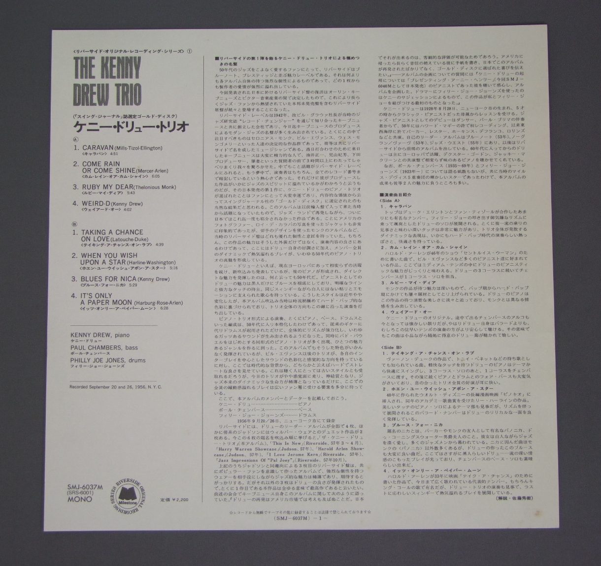 KENNY DREW TRIO/WITH PAUL CHAMBERS PHILLY JOE JONES SMJ6037 製造国:日本盤 / Media:LP外観:EX盤の状態:EX+ 価格(税込):¥1,047(売約済) 送料 7inch:定形外郵便 360円~LP:定形外郵便 660円~送料は、注文の最終画面で確認頂けます。 > > KENNY DREW TRIO/WITH PAUL CHAMBERS PHILLY JOE JONES 外観 (EX)特記事項:表裏ジャケ共に薄いよごれが少し有る感じですが、ジャケ表面は全体的にスレやスリキズ、よごれ等は薄い感じ。外観EXの共通説明:ダメージが限定的。中古品としては保存状態がよい方。シミ、ヨゴレ、スレ 少し~軽度。 盤の状態 (EX+)特記事項:薄いスリキズ・スレ少し。一見してきれいな状態です。盤EX+の共通説明:盤面の極薄いスリキズ、スレ少し程度 音に出そうなものは無いように見える(極軽微なソフトティック音は除く)。 Tweet それぞれの画像をクリックすると、大きい写真が見られます こちらの商品もお勧めです 770円 DAS GUNTER NORIS TRIO - COLLUM - WALCHAギュンター・ノリス・トリオ - ヘルベルト・コルム - ヴァルヒャ / BACH - TOCCATA & FUGUEジャズとクラシックによる 2つのバッハ 770円 BRUCE FORMANブルース・フォアマン / FIVER JOURNEYリヴァー・ジャーニー 770円 LAMBERT-HENDRICKS & ROSS / SING ALONG WITH BASIEシング・アロング・ウィズ・べイシー 770円 RALPH SIMONラルフ・サイモン / TIME BEINGタイム・ビーイング 770円 BRUBECK & LAVERNE TRIO / SEE HOW IT FEELS想いのままに 1,210円 JOHN KLEMMERジョン・クレマー / MAGNIFICENT MADNESSマグニフィセント・マッドネス 1,650円 MASARU IMADA今田勝 / MINT BREEZEミント・ブリーズ 770円 THAD JONES & MEL LEWISサド・ジョーンズ & メル・ルイス / LIVE IN TOKYOライブ・イン・東京